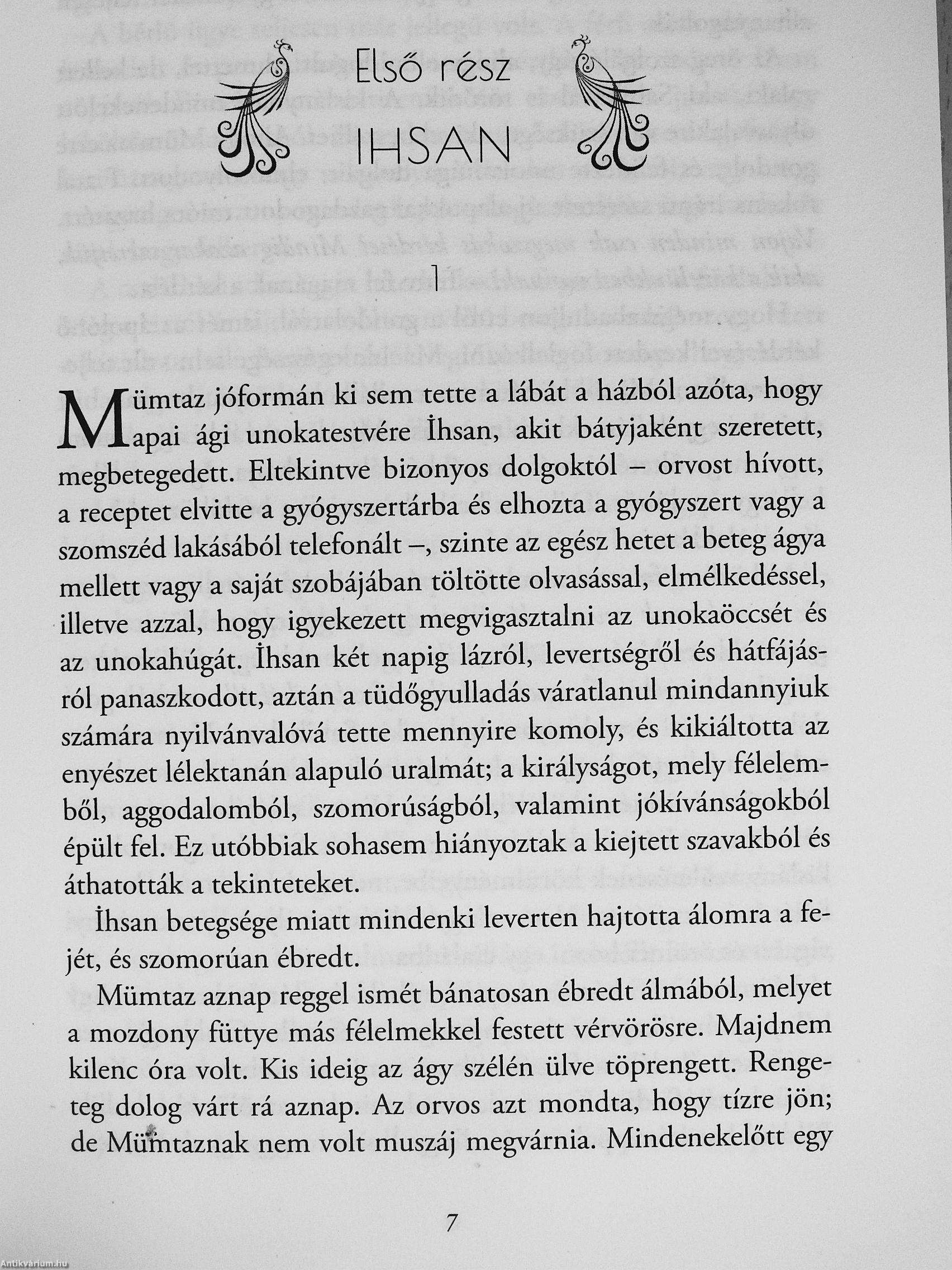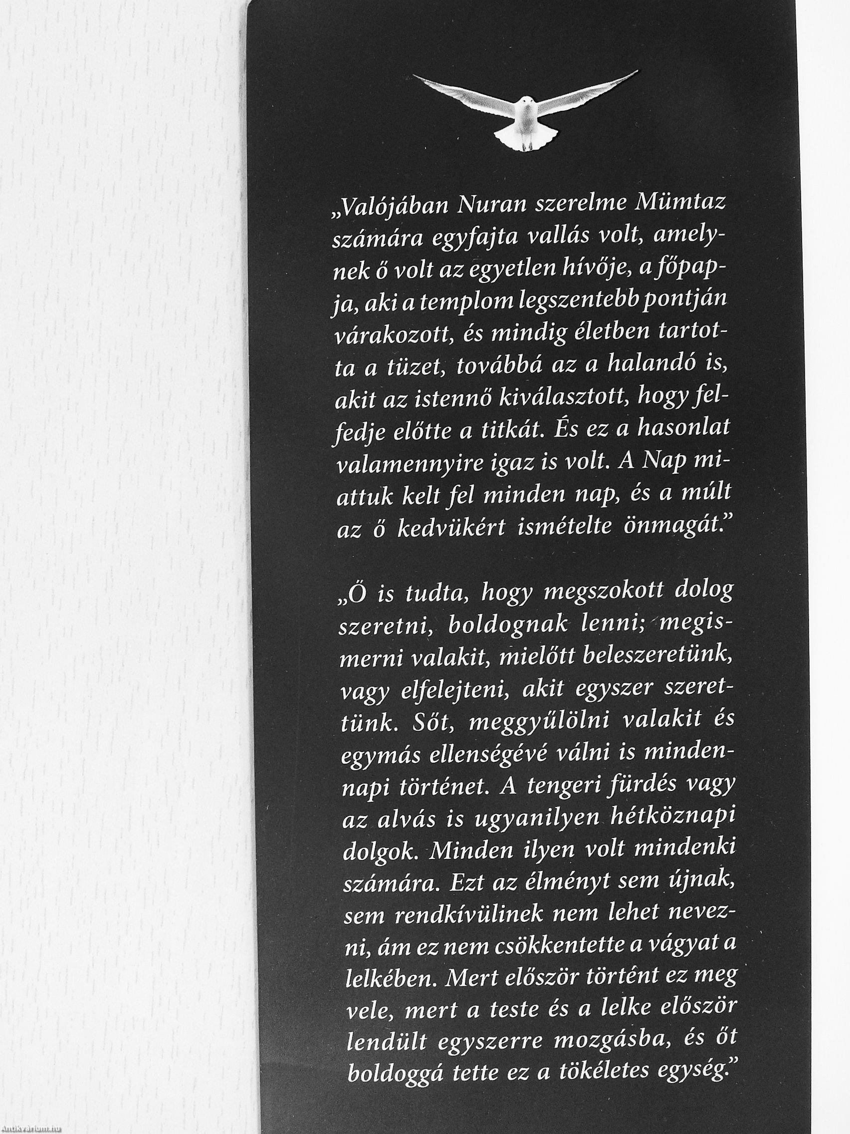„Valójában Nuran szerelme Mümtaz számára egyfajta vallás volt, amelynek ö volt az egyetlen hívője, a főpapja, aki a templom legszentebb pontján várakozott, és mindig életben tartotta a tüzet, továbbá az a halandó is, akit az istennő kiválasztott, hogy felfedje előtte a titkát. És ez a hasonlat valamennyire igaz is volt. A Nap miattuk kelt fel minden nap, és a múlt az ő kedvükért ismételte önmagát."