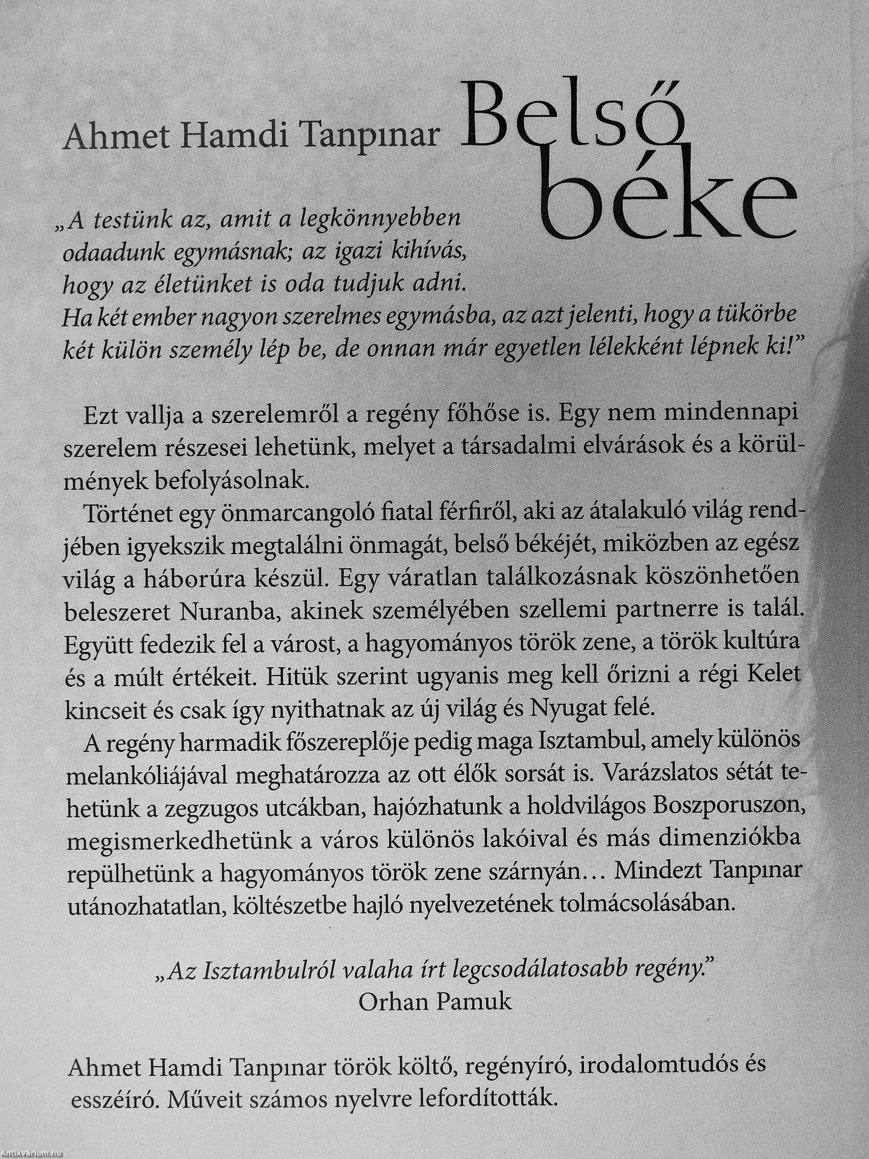Ahmet Hamdi Tanpinar műveinek az Antikvarium.hu-n kapható vagy előjegyezhető listáját itt tekintheti meg: Ahmet Hamdi Tanpinar könyvek, művek