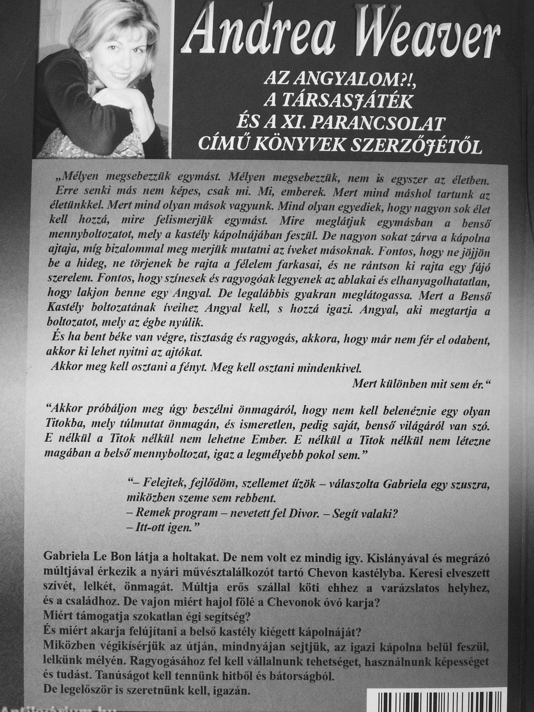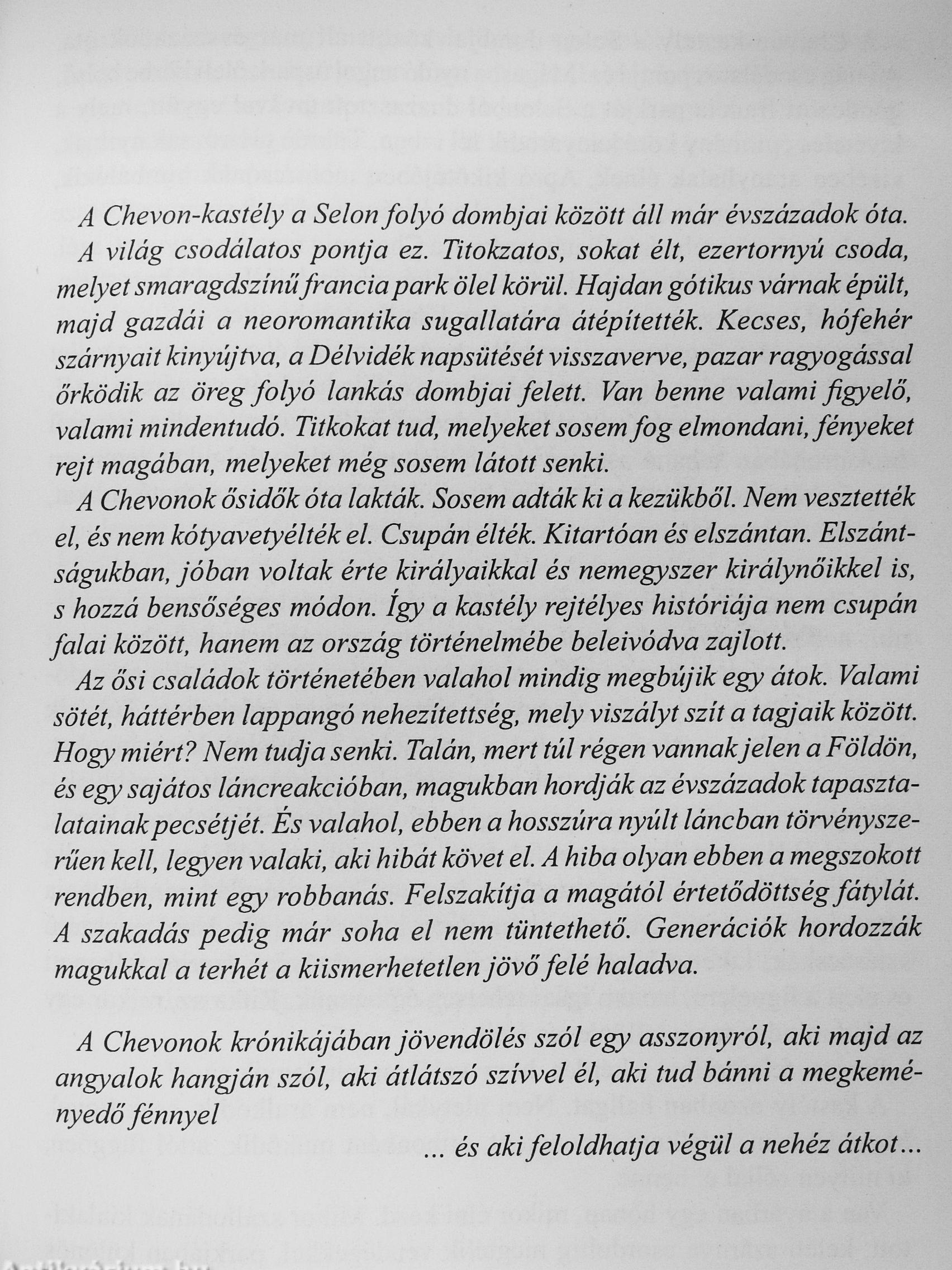 Gabriela Le Bon látja a holtakat. De nem volt ez mindig íg>'. Kislányával és megrázó múltjával érkezik a nyári művésztalálkozót tartó Chevon kastélyba. Keresi elveszett szívét, lelkét, önmagát. Múltja erős szállal köti ehhez a varázslatos helyhez, és a családhoz. De vajon miért hajol fölé a Chevonok óvó karja? Miért támogatja szokatlan égi segítség? És miért akarja felújítani a belső kastély kiégett kápolnáját?