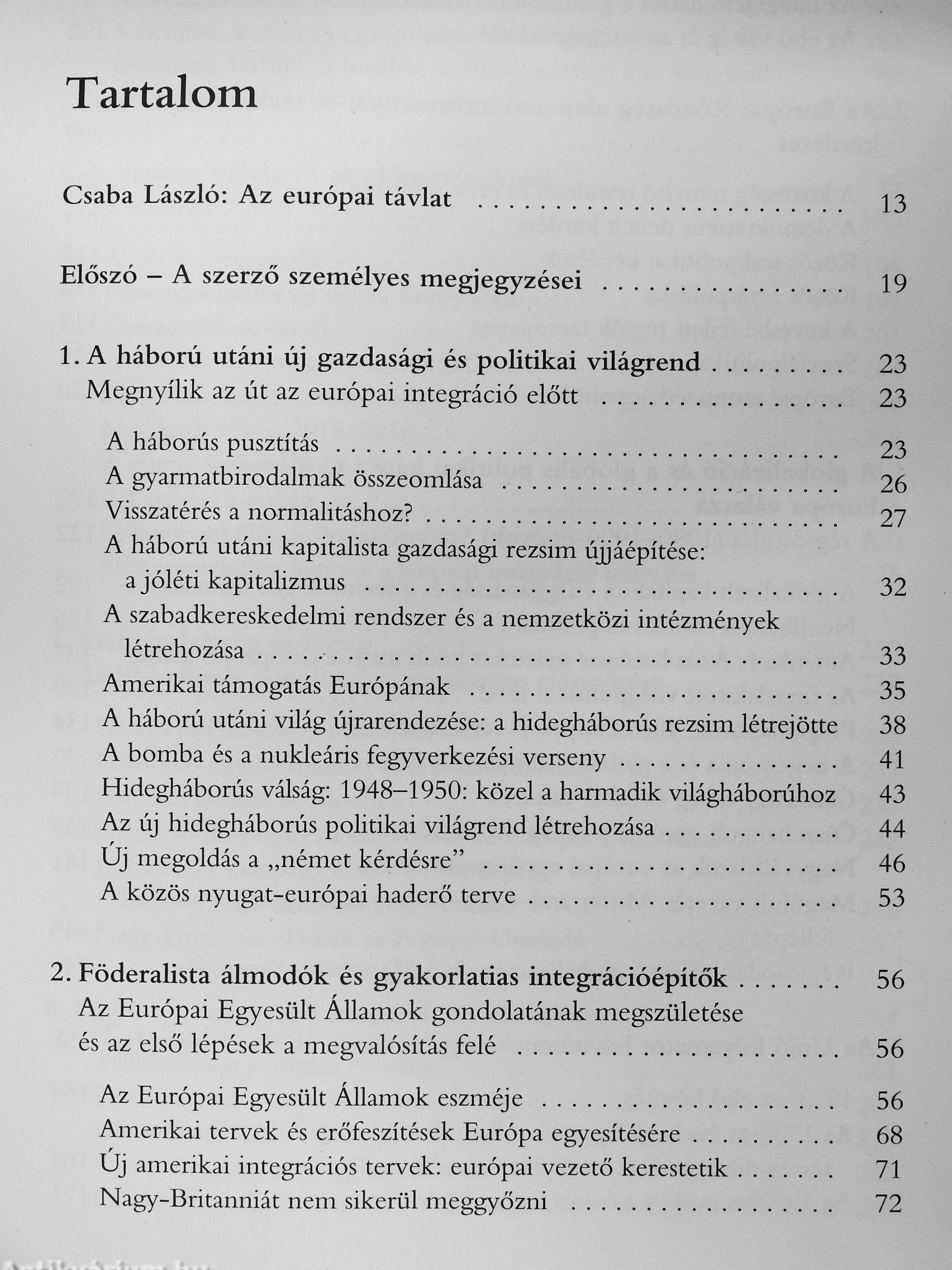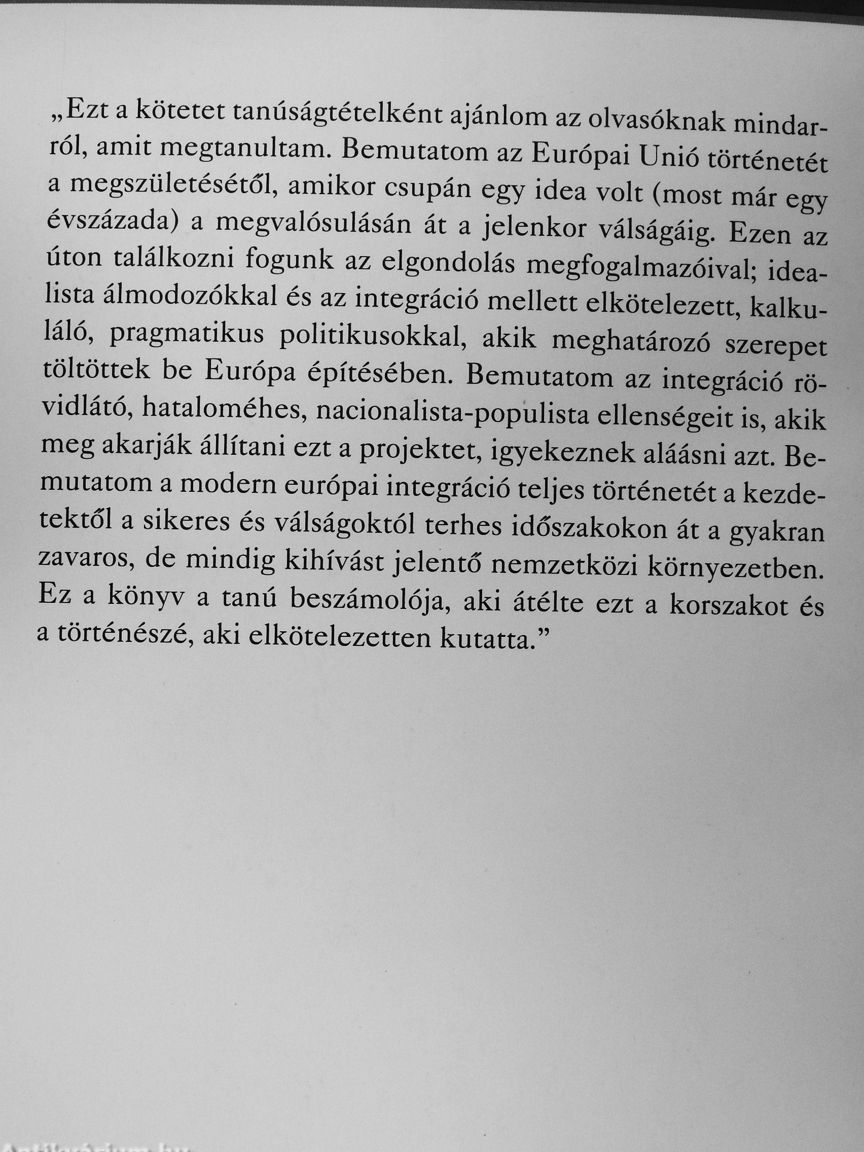„Ezt a kötetet tanúságtételként ajánlom az olvasóknak mindarról, amit megtanultam. Bemutatom az Európai Unió történetét a megszületésétől, amikor csupán egy idea volt (most már egy évszázada) a megvalósulásán át a jelenkor válságáig. Ezen az úton találkozni fogunk az elgondolás megfogalmazóival; idealista álmodozókkal és az integráció mellett elkötelezett, kalkuláló, pragmatikus politikusokkal, akik meghatározó szerepet töltöttek be Európa építésében. Bemutatom az integráció rövidlátó, hataloméhes, nacionalista-populista ellenségeit is, akik meg akarják állítani ezt a projektet, igyekeznek aláásni azt. Bemutatom a modern európai integráció teljes történetét a kezdetektől a sikeres és válságoktól terhes időszakokon át a gyakran zavaros, de mindig kihívást jelentő nemzetközi környezetben. Ez a könyv a tanú beszámolója, aki átélte ezt a korszakot és a történészé, aki elkötelezetten kutatta."