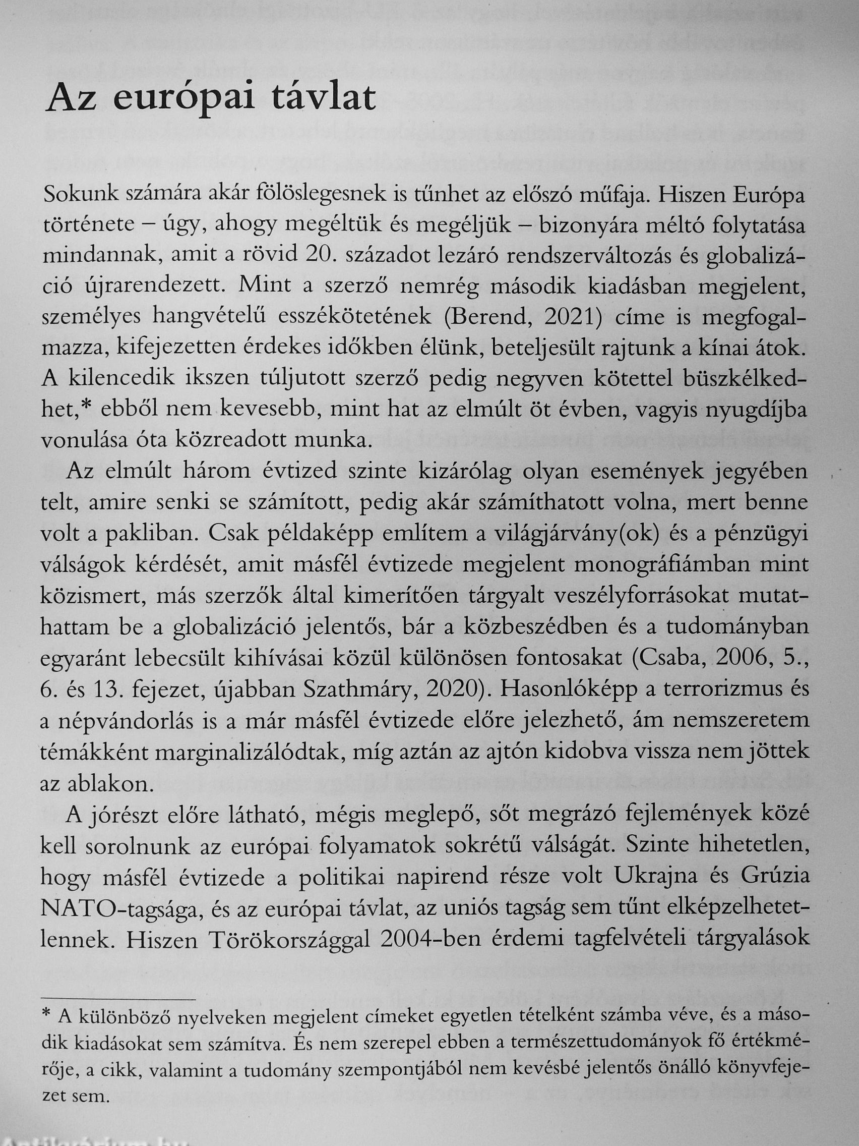 BEREND T. IVÁN könyve átfogó képet ad az európai integráció történetéről az Európai Egyesült Államok gondolatának a megszületésétől a mai napig. Kndkai elemzés tárgyává teszi az Egyesült Államok különleges szerepét az integrációs folyamatban, illetve az Európai Unió bővülésében és evolúciójában. A könyv vizsgálja az Európai Unióról kialakult jelenlegi képet és a bonyolult válsághelyzetet, ami a Covid-19 világjárvány nyomán állt elő.