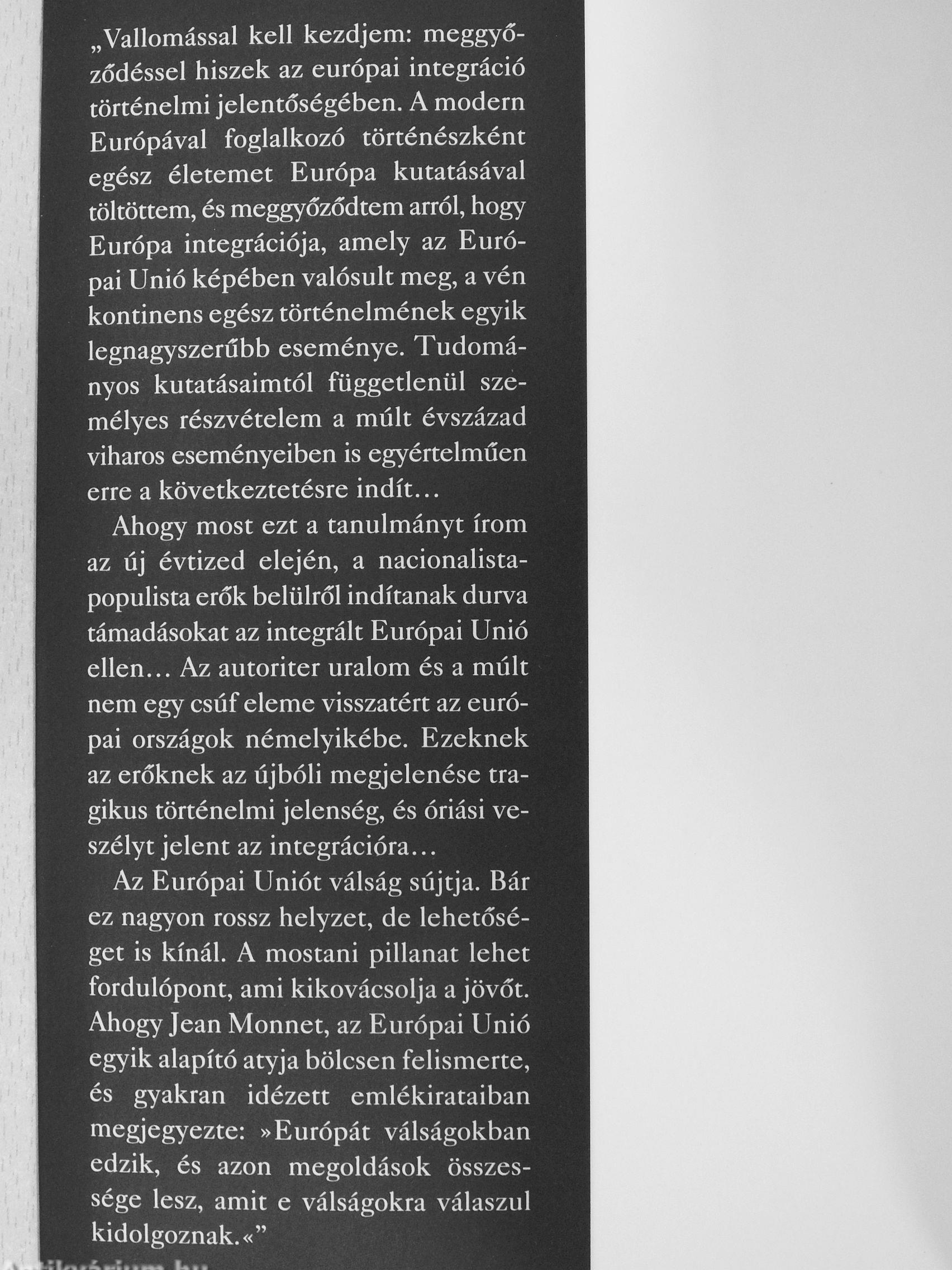 „Vallomással kell kezdjem: meggyőződéssel hiszek az európai integráció történelmi jelentőségében. A modern Európával foglalkozó történészként egész életemet Európa kutatásával töltöttem, és meggyőződtem arról, hogy Európa integrációja, amely az Európai Unió képében valósult meg, a vén kontinens egész történelmének egyik legnagyszerűbb eseménye. Tudományos kutatásaimtól függetlenül személyes részvételem a múlt évszázad viharos eseményeiben is egyértelműen erre a következtetésre indít