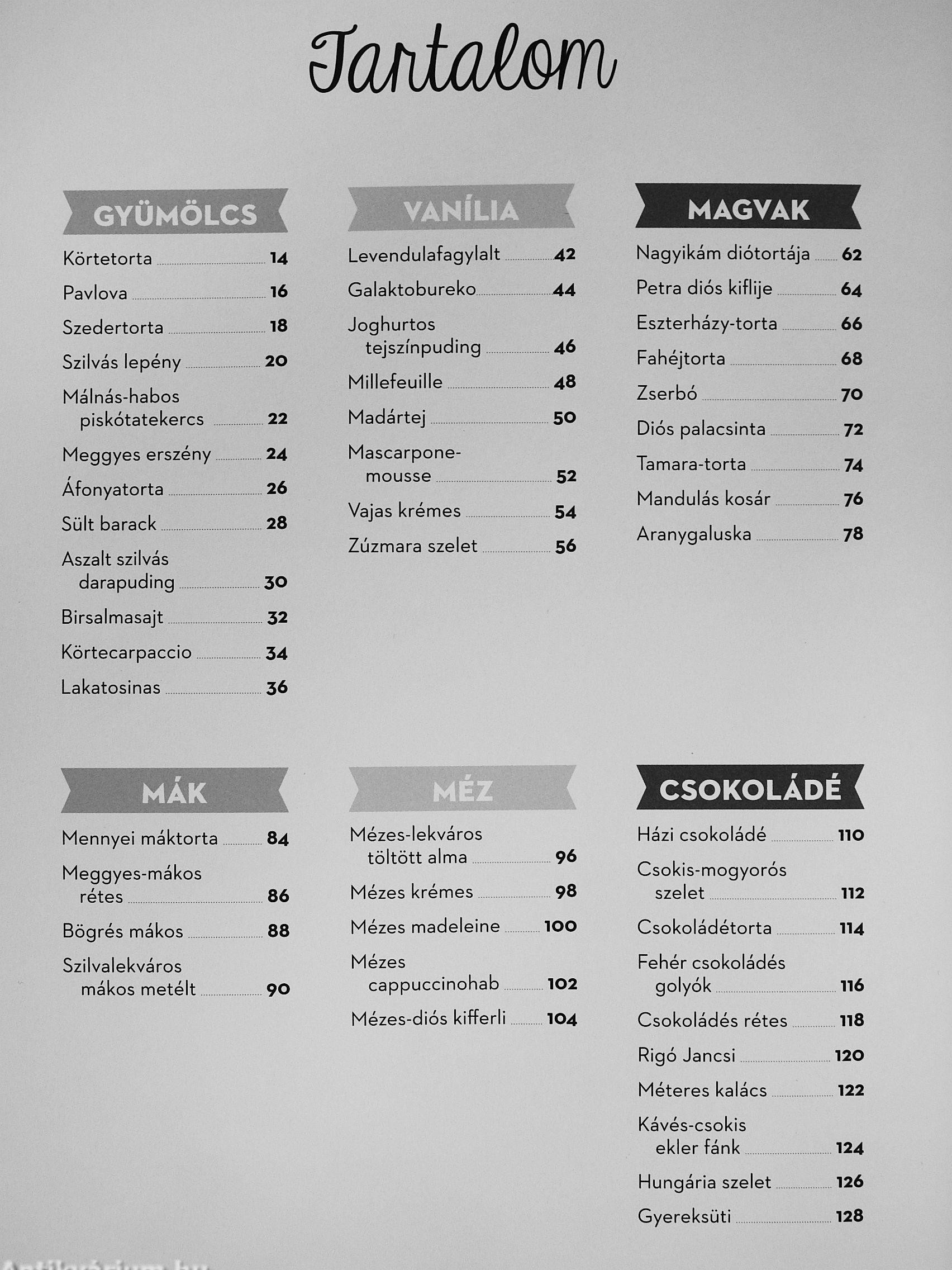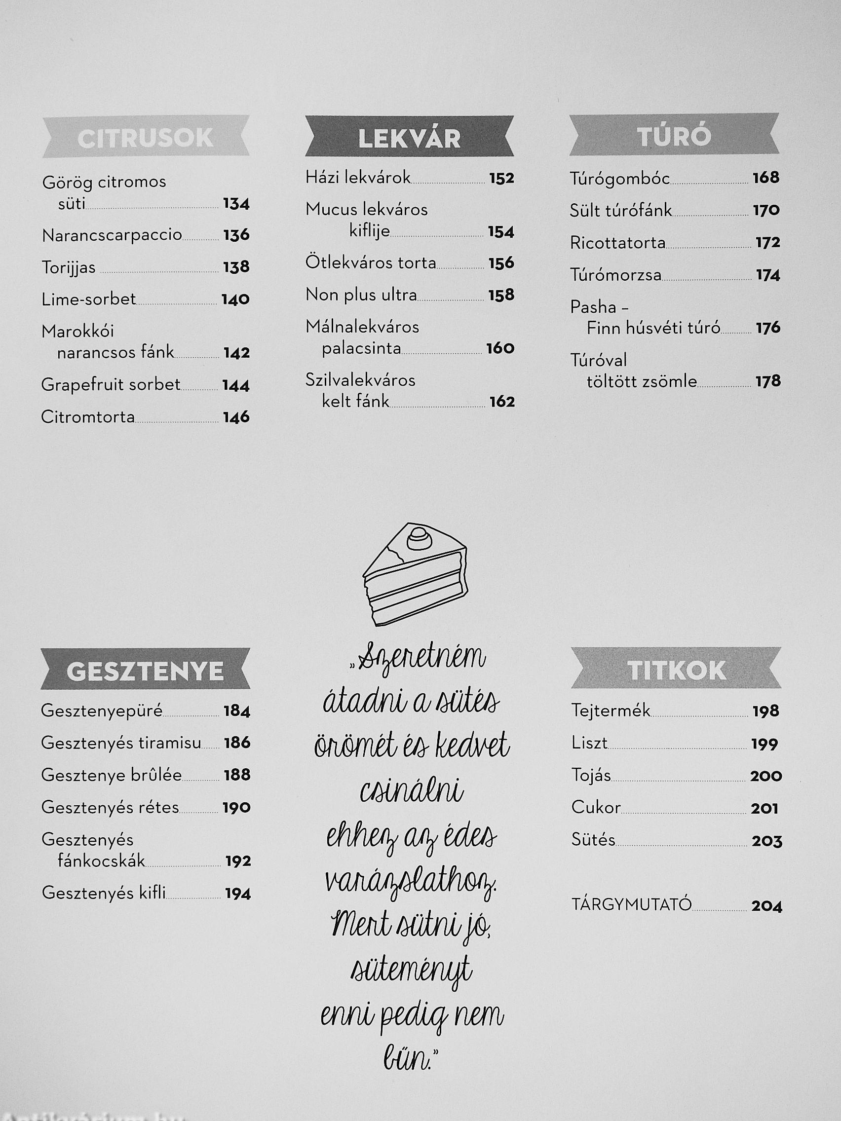 Ezért aztán a Süteményeskönyv új kiadása egy vadonatúj fejezettel is kiegészül, ami a legújabb trendekkel lépést tartva a gesztenyés sütemények világába vezeti el az olvasót. De ha a töltelék változik is, a jól bevált alaptészta megmarad: a könyv továbbra is logikusan, a fő hozzávalók szerint gyűjti csoportokba a süteményeket, fejezetenként véve sorra a gyümölcsös, vaníliás, magvas, mákos, mézes, csokoládés, citrusos, lekváros, túrós és gesztenyés recepteket.