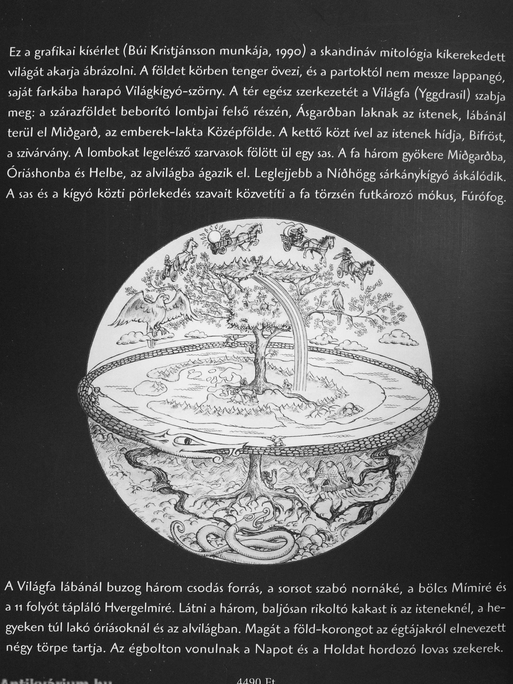 Ez a grafikai kísérlet (Búi Krístjánsson munkája, 1990) a skandináv mitológia kikerekedett világát akarja ábrázolni. A földet körben tenger övezi, és a partoktól nem messze lappangó, saját farkába harapó Világkígyó-szörny. A tér egész szerkezetét a Világfa (Yggdrasil) szabja meg: a szárazföldet beborító lombjai felső részén, Asgaröban laknak az istenek, lábánál terül el Miógarö, az emberek-lakta Középfölde. A kettő közt ível az istenek hídja, Bifröst, a szivárvány. A lombokat legelésző szarvasok fölött ül egy sas. A fa három gyökere Miógaróba, Óriáshonba és Helbe, az alvilágba ágazik el. Leglejjebb a Nióhögg sárkánykígyó áskálódik. A sas és a kígyó közti pörlekedés szavait közvetíti a fa törzsén futkározó mókus. Fúrófog.