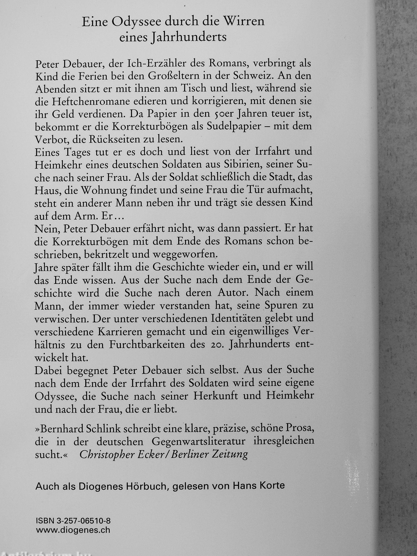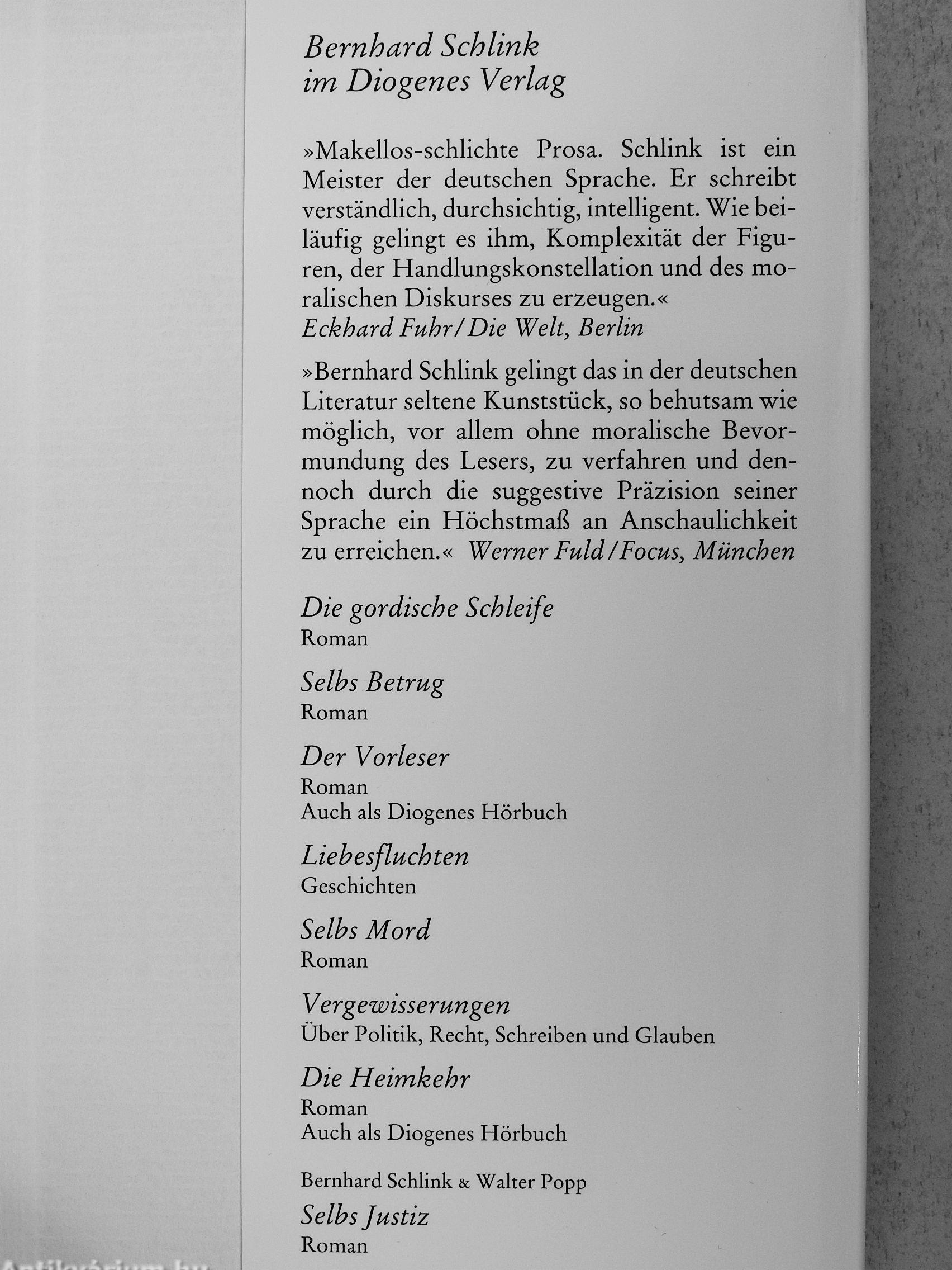 »Schlinks Texte sind ungewöhnlich in der deutschen Gegenwartsliteratur, weil sich in ihnen das handfeste, aktionsreiche story telling nach angelsächsischem Muster mit einer selbstreflexiven Gedankenprosa verbindet.« Peter von Becker/Der Tagesspiegel, Berlin