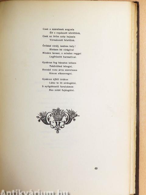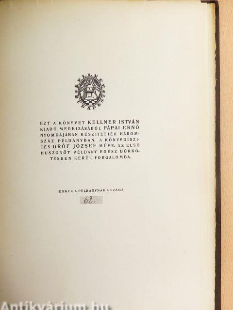 | Megjegyzés: | Fekete-fehér illusztrációkkal díszített kiadás. Ezt a könyvet Kellner István kiadó megbízásából Pápai Ernő nyomdájában készítették háromszáz példányban. A könyvdíszítés Gróf József műve. Az első huszonöt példány egész bőrkötésben kerül forgalomba. Számozott kiadás. |