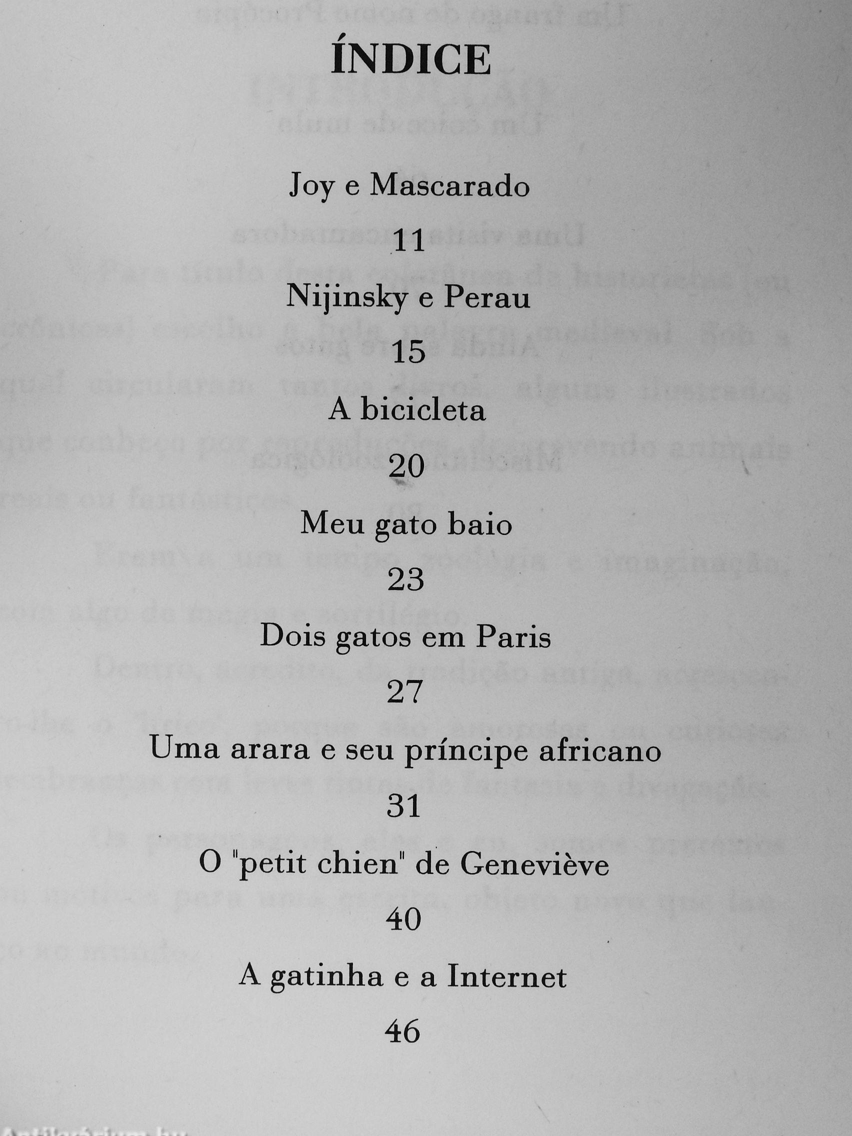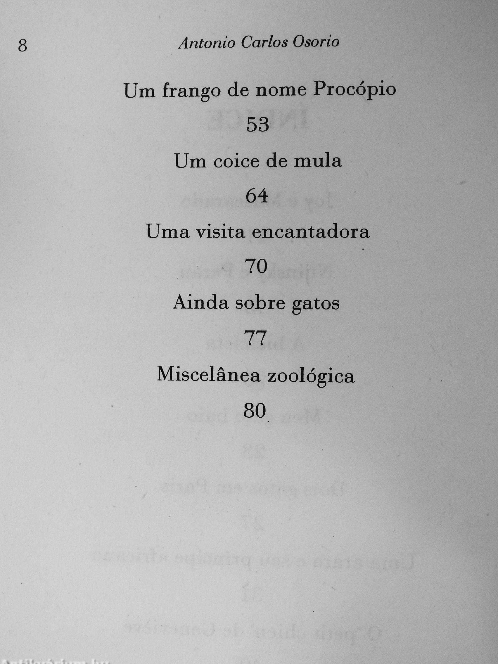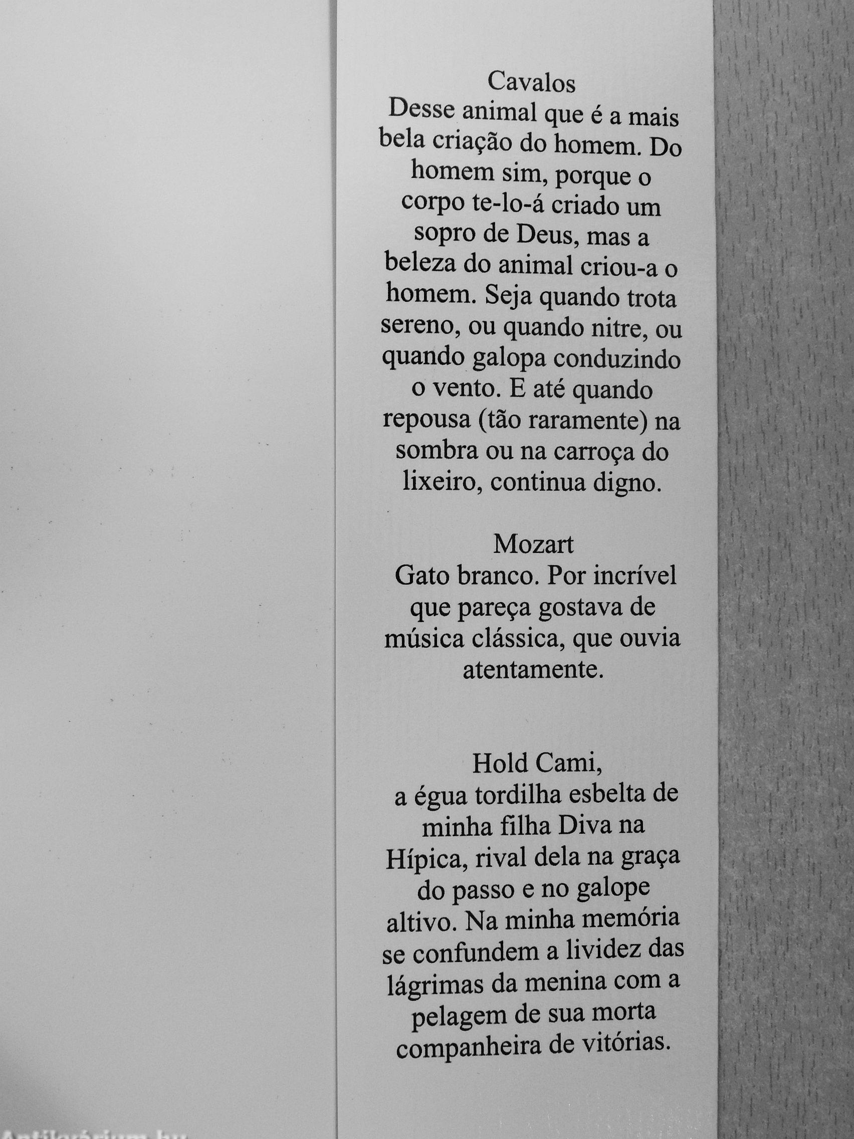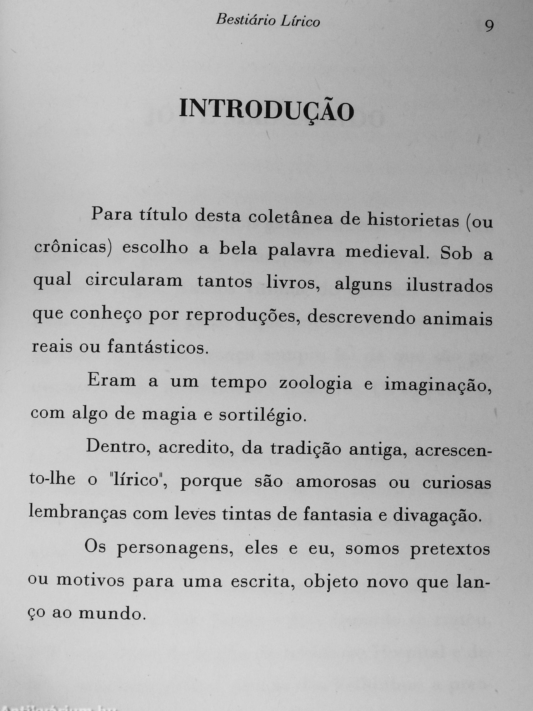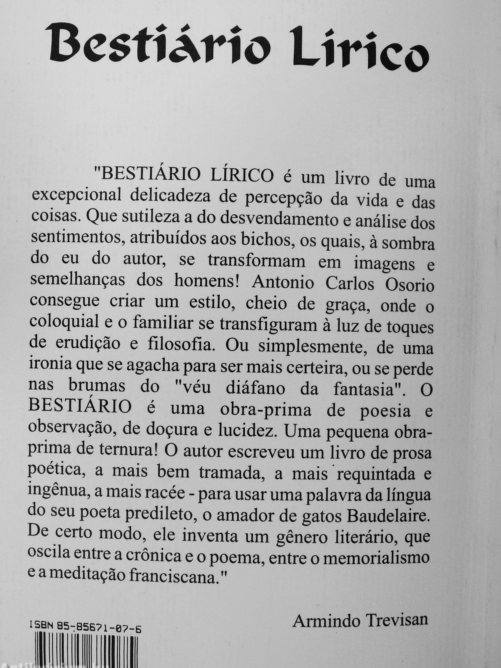"BESTIARIO LIRICO é um livro de urna excepcional delicadeza de percepçâo da vida e das coisas. Que sutileza a do desvendamento e análise dos sentimentos, atribuidos aos bichos, os quais, a sombra do eu do autor, se transformam em imagens e semelhanças dos homens! Antonio Carlos Osorio consegue criar um estilo, cheio de graça, onde o coloquial e o familiar se transfiguram a luz de toques de erudiçâo e filosofía. Ou simplesmente, de uma ironia que se agacha para ser mais certeira, ou se perde nas brumas do "véu diáfano da fantasia". O BESTIÁRIO é uma obra-prima de poesia e observaçâo, de doçura e lucidez. Uma pequena obra-prima de temura! O autor escreveu um livro de prosa poética, a mais bem tramada, a mais requintada e ingenua, a mais racée - para usar uma palavra da língua do seu poeta predileto, o amador de gatos Baudelaire. De certo modo, ele inventa um género literário, que oscila entre a crónica e o poema, entre o memorialismo e a meditaçâo franciscana. "