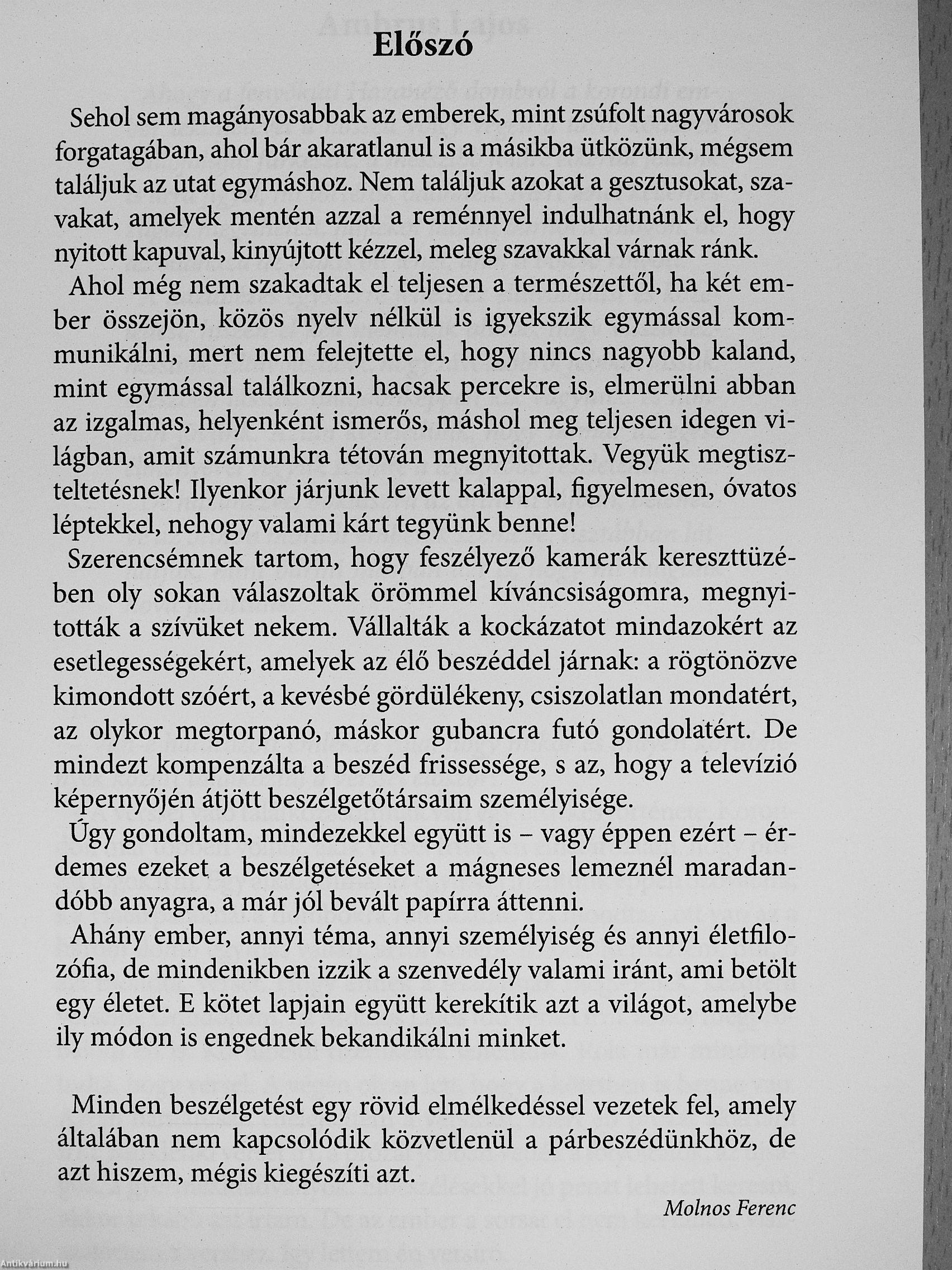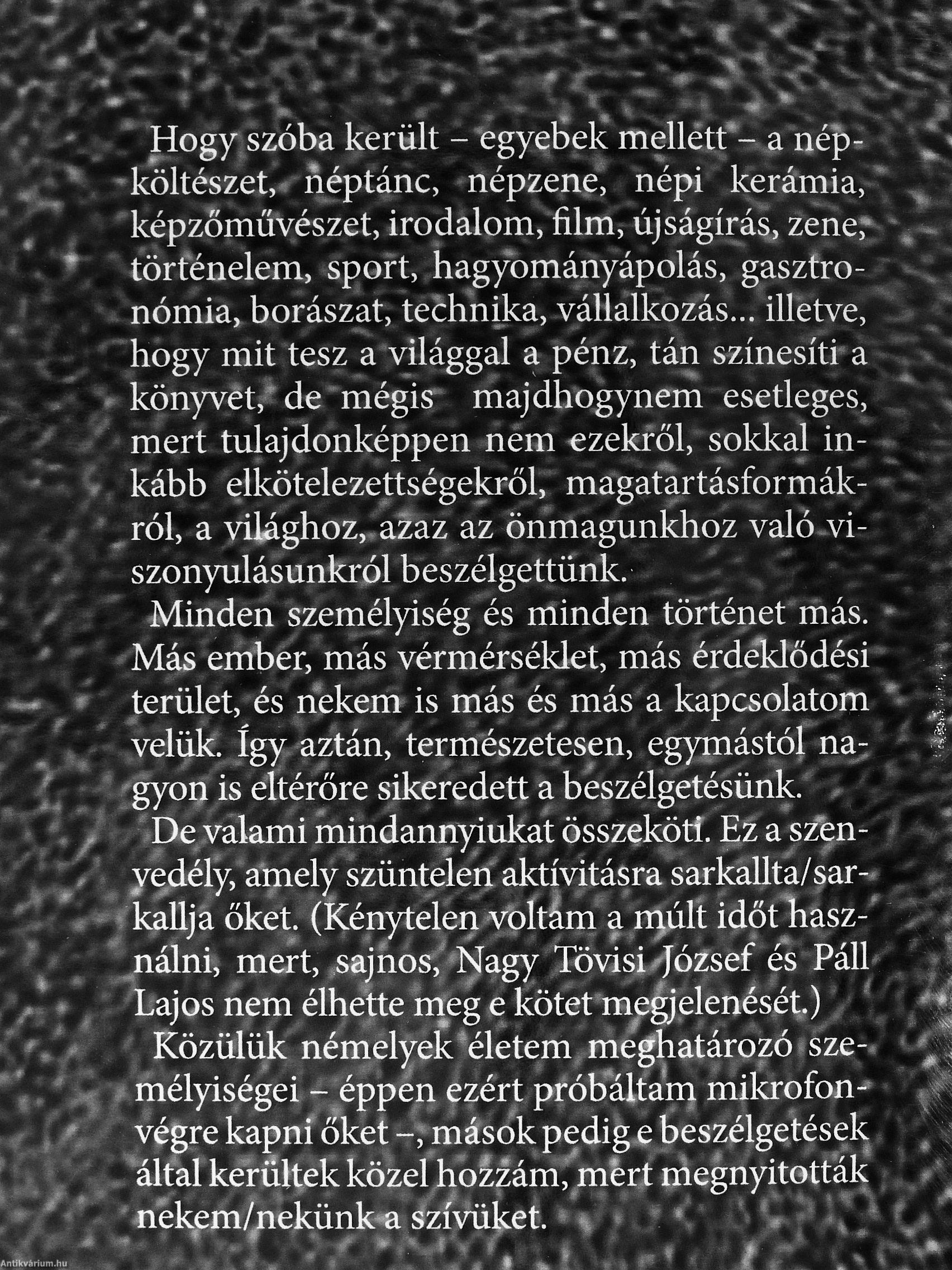Hogy szóba került - egyeSek mellett - a népköltészet, néptánc, népzene, népi kerámia, képzőművészet, irodalom, film, újságírás, zene; történelem, sport, hagyományápolás, gasztronómia, borászat, technika, vállalkozás illetve, hogy mit tesz a világgal a pénz, tán színesíti a könyvét, de mégis majdhogynem esetleges, mert tulajdonképpen nem ezekről, sokkal inkább elkötelezettségekről, magatartásformákról, a világhoz, azaz az önmagunkhoz való viszonyulásunkról beszélgettünk.