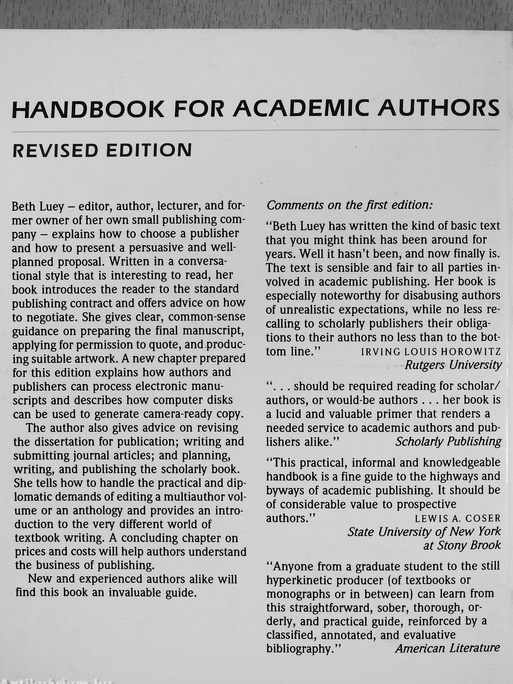 "Beth Luey has written the kind of basic text that you might think has been around for years. Well it hasn't been, and now finally is. The text is sensible and fair to all parties involved in academic publishing. Her book is especially noteworthy for disabusing authors of unrealistic expectations, while no less recalling to scholarly publishers their obligations to their authors no less than to the bottom line." irving louis horowitz