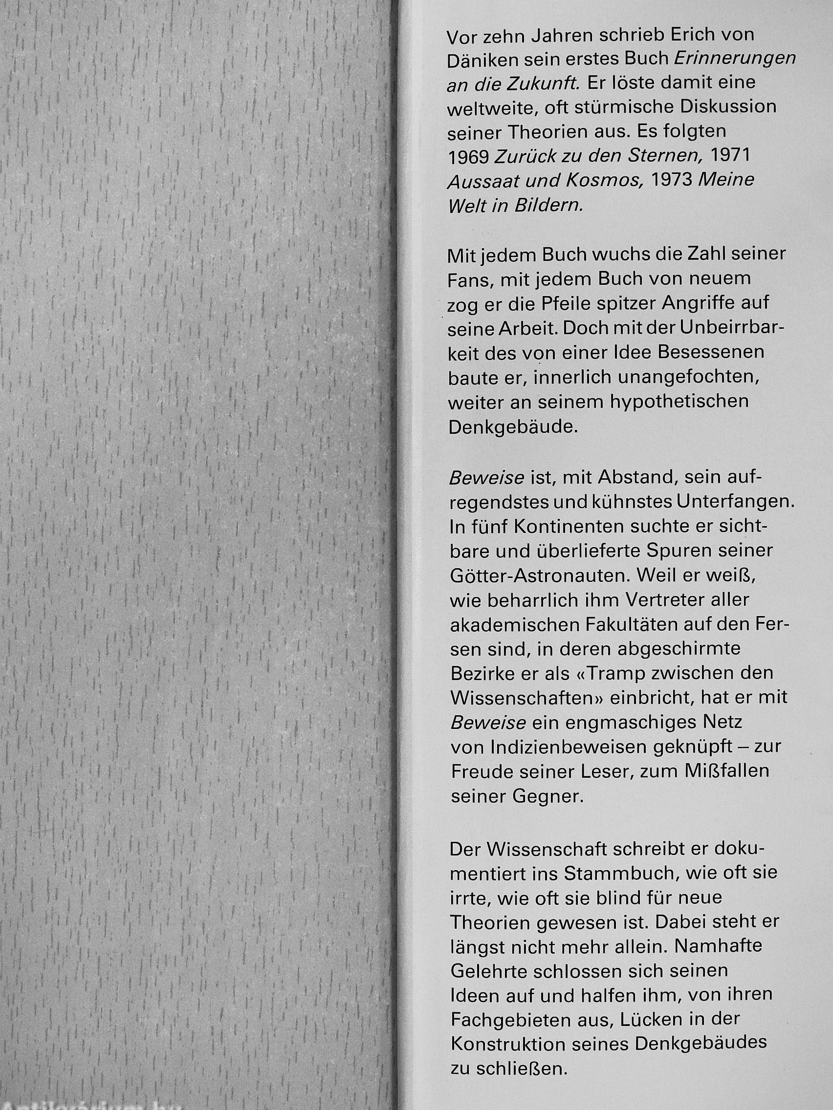 Beweise ist, mit Abstand, sein aufregendstes und kühnstes Unterfangen. In fünf Kontinenten suchte er sichtbare und überlieferte Spuren seiner Götter-Astronauten. Weil er weiß, wie beharrlich ihm Vertreter aller akademischen Fakultäten auf den Fersen sind, in deren abgeschirmte Bezirke er als «Tramp zwischen den Wissenschaften» einbricht, hat er mit Beweise ein engmaschiges Netz von Indizienbeweisen geknüpft-zur Freude seiner Leser, zum Mißfallen seiner Gegner.