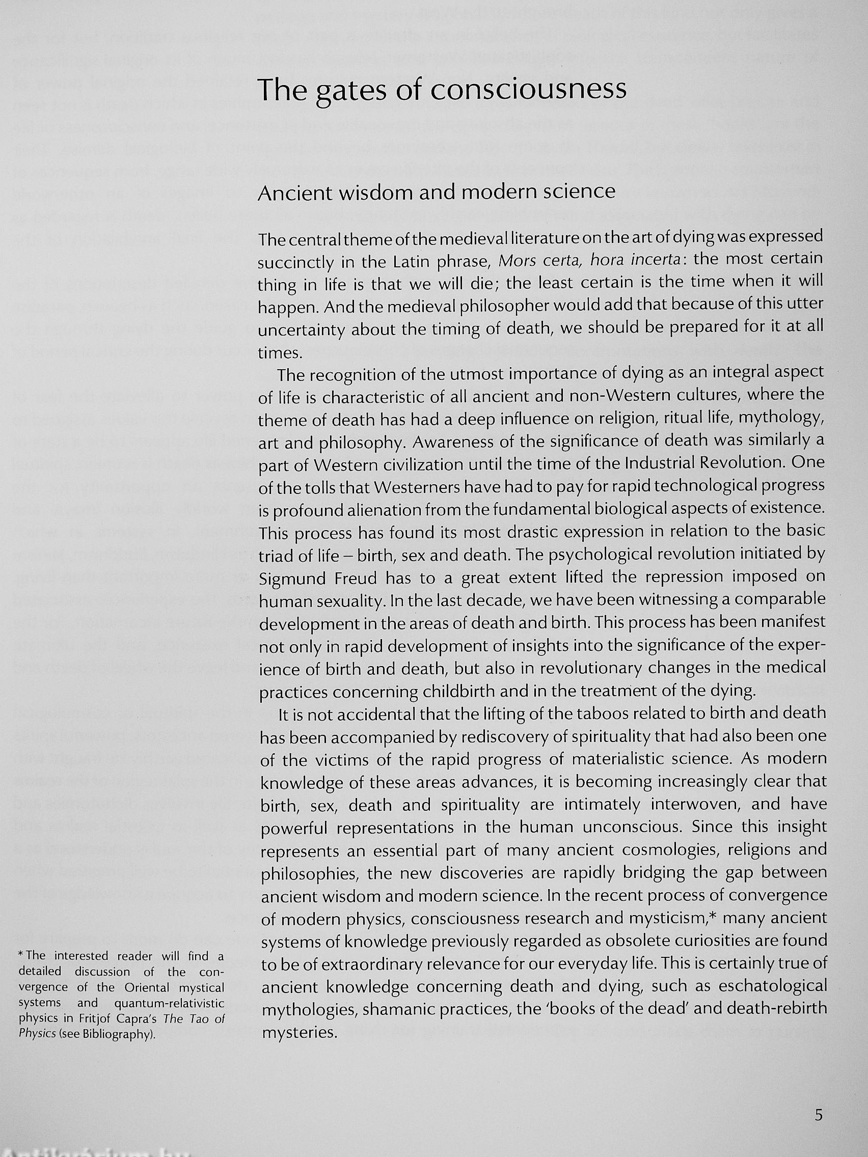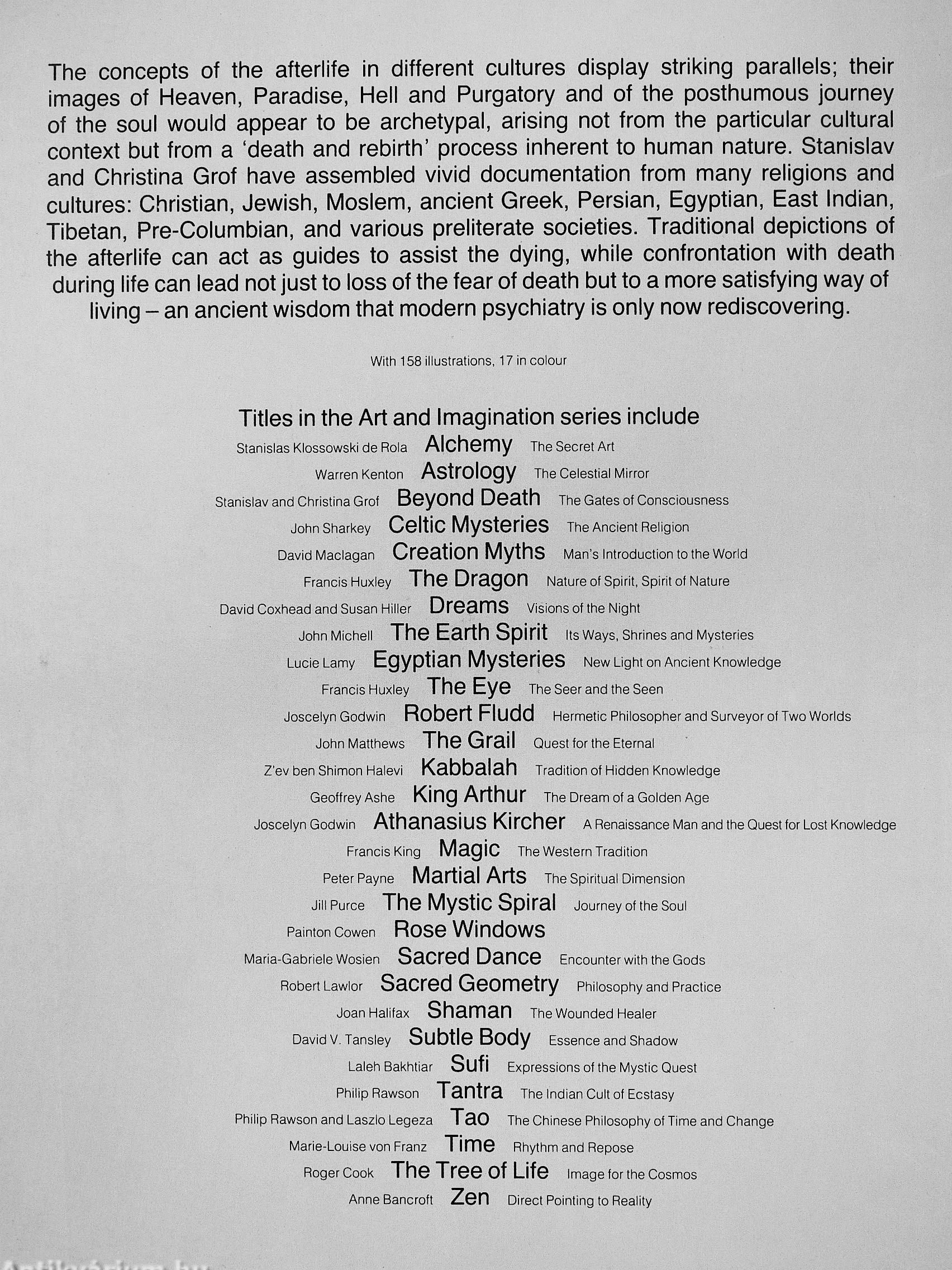 The concepts of the afterlife in different cultures display striking parallels; their images of Heaven, Paradise, Hell and Purgatory and of the posthumous journey of the soul would appear to be archetypal, arising not from the particular cultural context but from a 'death and rebirth' process inherent to human nature. Stanislav and Christina Grof have assembled vivid documentation from many religions and cultures: Christian, Jewish, Moslem, ancient Greek, Persian, Egyptian, East Indian, Tibetan, Pre-Columbian, and various preliterate societies. Traditional depictions of the afterlife can act as guides to assist the dying, while confrontation with death during life can lead not just to loss of the fear of death but to a more satisfying way of living - an ancient wisdom that modern psychiatry is only now rediscovering.