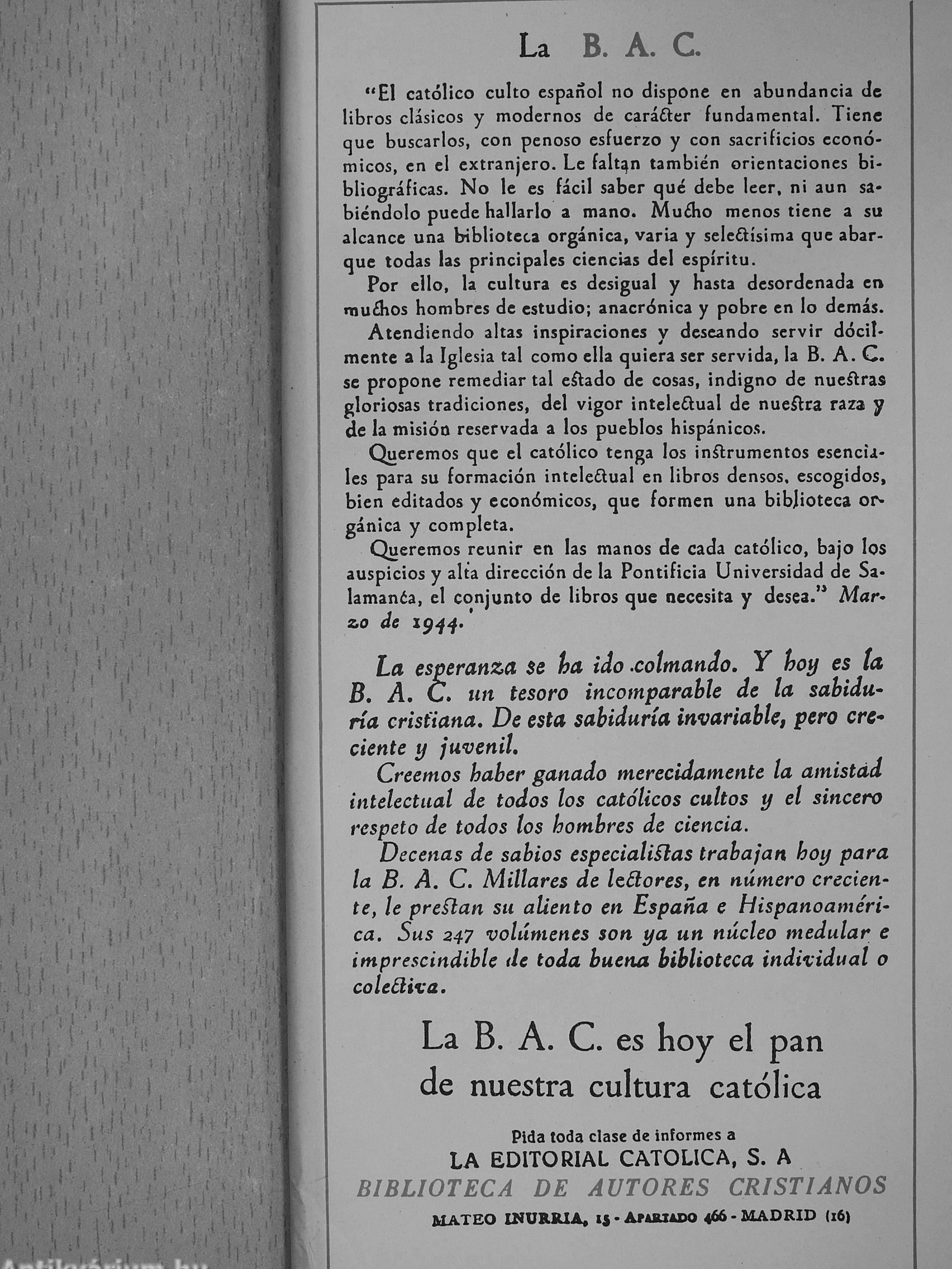 Atendiendo altas inspiraciones y deseando servir dócilmente a la Iglesia tal como ella quiera ser servida, la B. A. C. se propone remediar tal eílado de cosas, indigno de nueílras gloriosas tradiciones, del vigor inteleÜual de nueálra raza y de la misión reservada a los pueblos hispánicos.