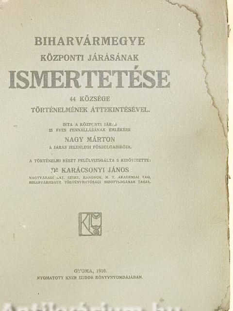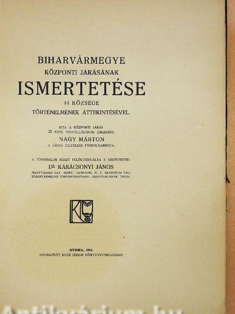 Nyomatott Kner Izidor Könyvnyomdájában. Irta a központi járás 25 éves fennállásának emlékére Nagy Márton a járás jelenlegi főszolgabirója. A történelmi részt felülvizsgálta s kibővitette: Dr. Karácsonyi János nagyváradi lat. szert. kanonok, M. T. akademiai tag, Biharvármegye Törvényhatósági bizottságának tagja.