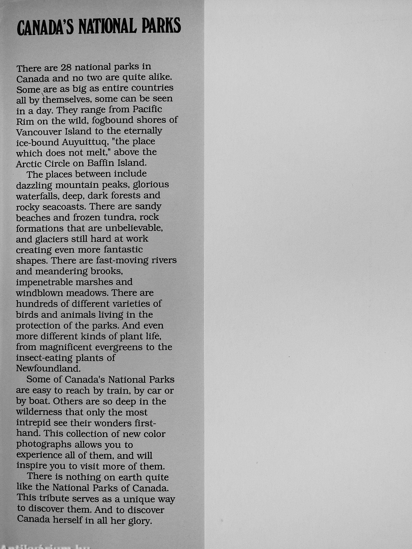 Some of Canada's National Parks are easy to reach by train, by car or by boat. Others are so deep in the wilderness that only the most intrepid see their wonders firsthand. This collection of new color photographs allows you to experience all of them, and will Inspire you to visit more of them.