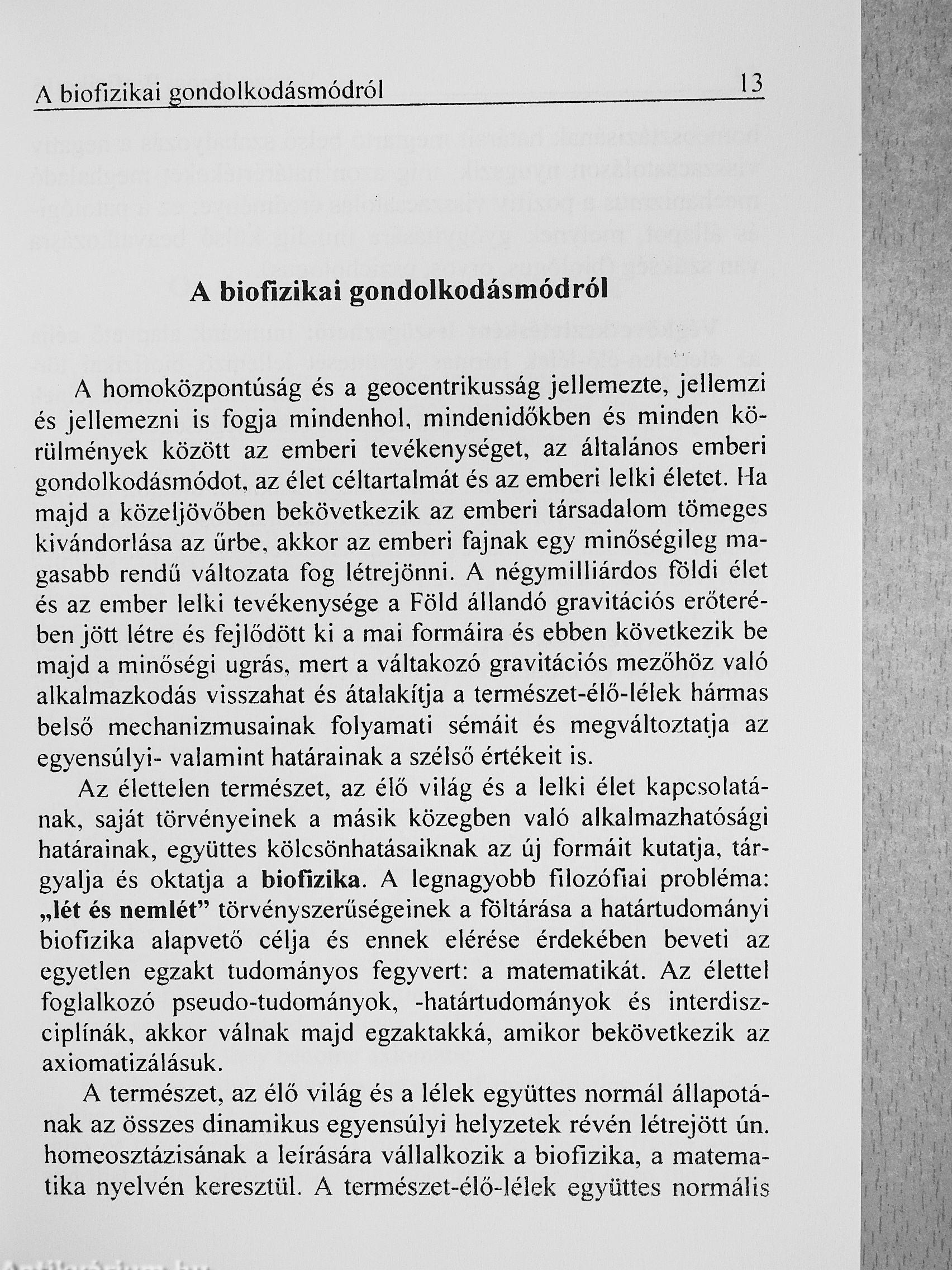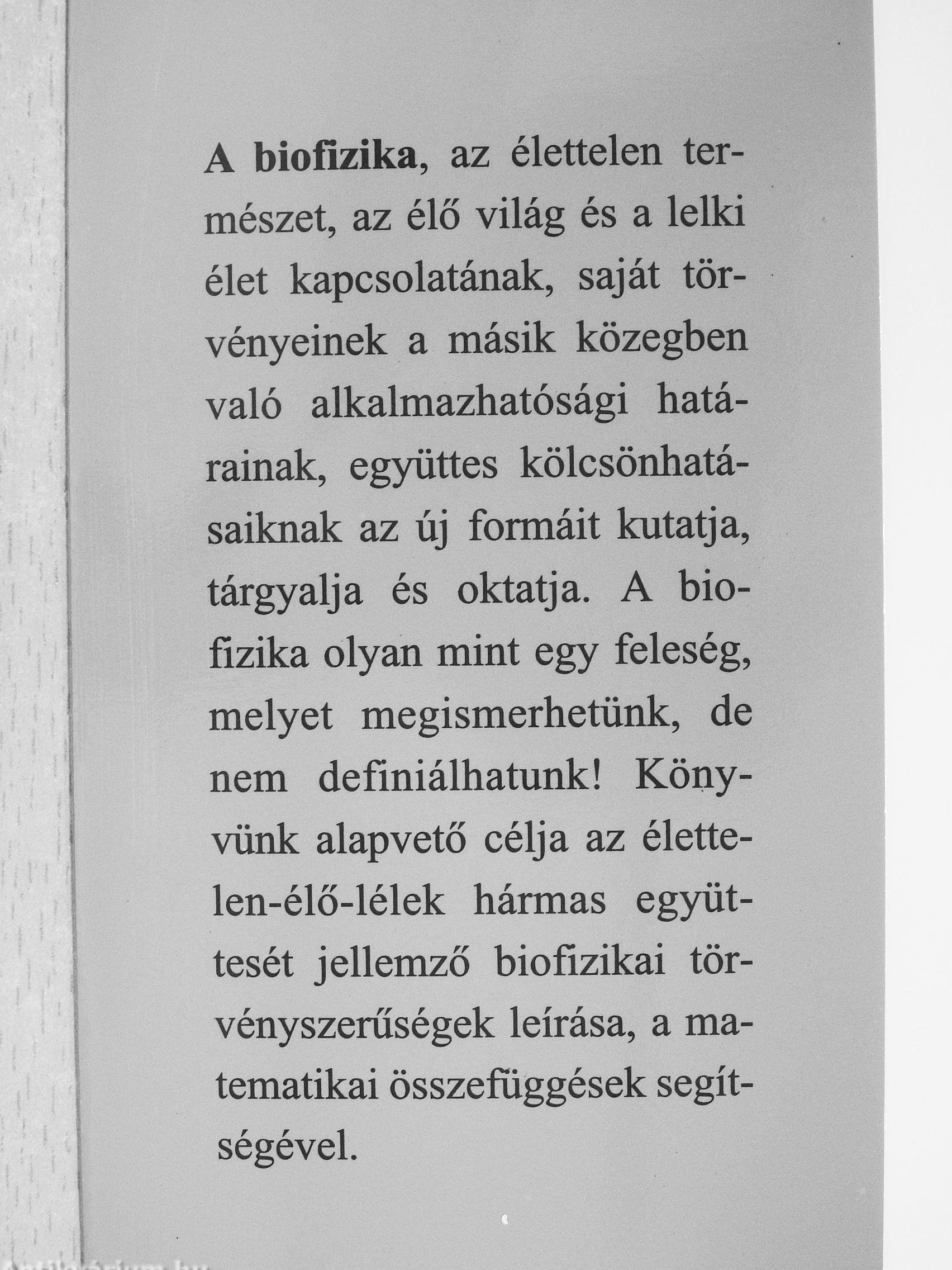 A biofizika, az élettelen természet, az élő világ és a lelki élet kapcsolatának, saját törvényeinek a másik közegben való alkalmazhatósági határainak, együttes kölcsönhatásaiknak az új formáit kutatja, tárgyalja és oktatja. A biofizika olyan mint egy feleség, melyet megismerhetünk, de nem definiálhatunk! Könyvünk alapvető célja az élette-len-élő-lélek hármas együttesét jellemző biofizikai törvényszerűségek leírása, a matematikai összefüggések segítségével.