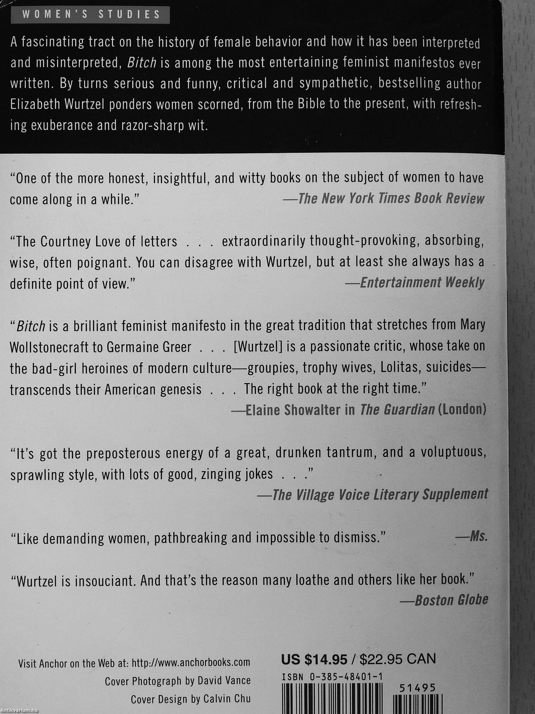 "Bitch is a brilliant feminist manifesto in the great tradition that stretches from Mary Wollstonecraft to Germaine Greer . . . [Wurtzel] is a passionate critic, whose take on the bad-girl heroines of modern culture—groupies, trophy wives, Lolitas, suicides— transcendstheir American genesis . . . The right book at the right time."