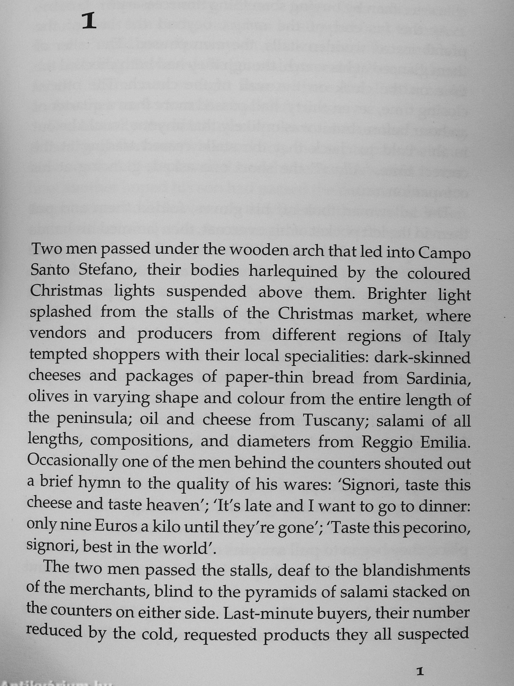 On a cold Venetian night shortly before Christmas, a street ^ vendor is killed in a scuffle in Campo Santo Stefano. The ''closest v^^itnesses to the event are the tourists who had been--browsing the man's wares before his death - fake handbags^ of every designer label. The dead man had been working as a vu cumpra, one of the many Black Africans purveying goods outside normal shop h6urs, trading without work permits.