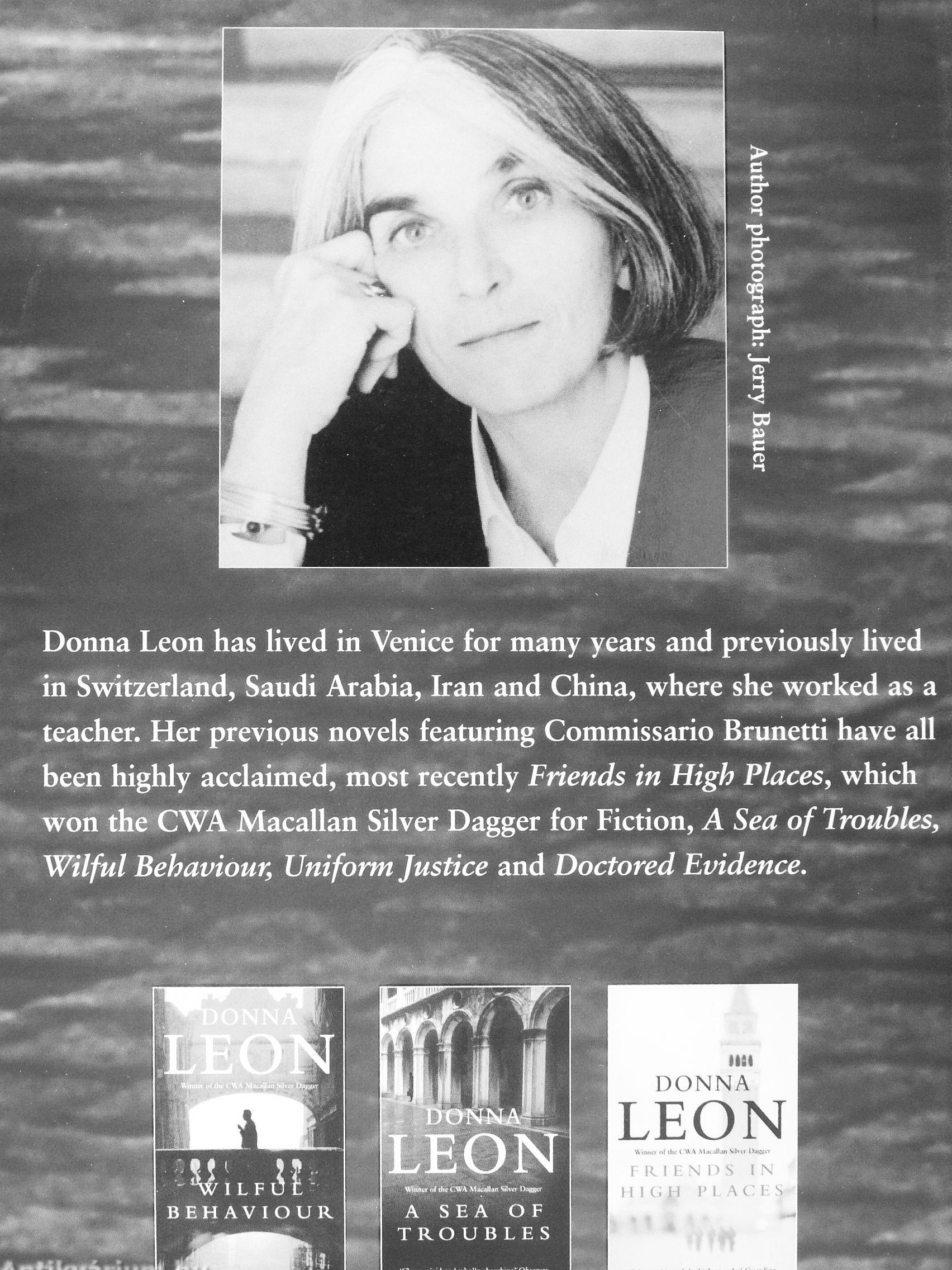 Donna Leon has lived in Venice for many years and previously lived-Ea'SMtZell Ad, Saudi Arabia, Jjrgn and China, where she wor]^^ a teacher. Her previous novels featuring Commissario Biuaetti have all be|;ji highly acelairtted^ ittott ficently Friends in High Places, which Wori tiiieW^^Jrf^callan Silv^JDagger for Fiction, A Sea of Troubles, Wtlful Behaviour, Uniforht Justice and Doctored Evidence.