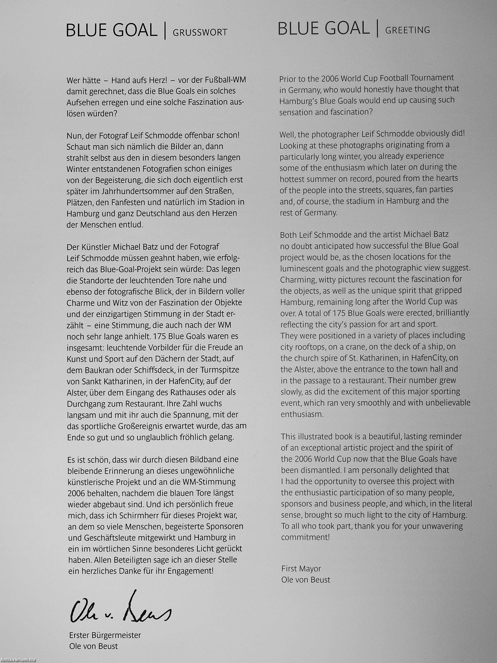 The blue luminescent objects created by artist Michael Batz were already shining for visitors and the citizens of Hamburg many months before the 2006 World Cup took place. When First Mayor Ole von Beust switched on the very first of the Blue Goals, high above the roofs of Hamburg, the vision of a "culture of illuminated cities" became reality. Word of the project soon got around, the news even spreading abroad, and photographer Leif Schmodde was also seized by the project's fascination. He set off on a long journey through Hamburg, ready to explore and discover this wonderful city once again - a city this time bathed in the magical glow of the Blue Goals. While doing so, he captured images of stirring beauty with his camera - far removed from the customary postcard aesthetics.
