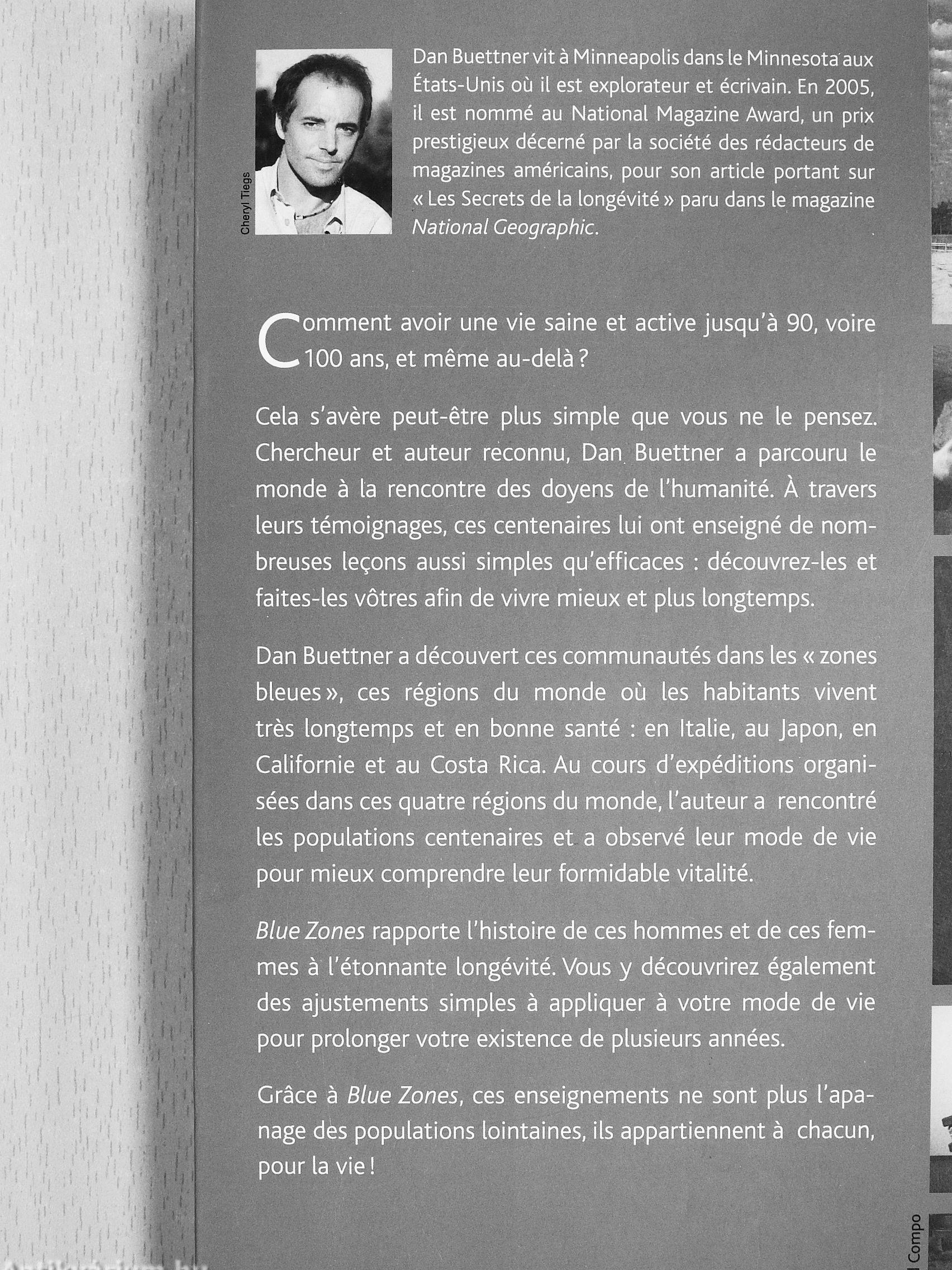 Dan Buettner vit a Minneapolis dans le Minnesota aux g États-Unis ou il est explorateur et écrivain. En 2005, V il est nommé au National Magazine Award, un prix prestigieux décerné par la société des rédacteurs de magazines américains, pour son article portant sur « Les Secrets de la longévité » paru dans le magazine National Geographic.