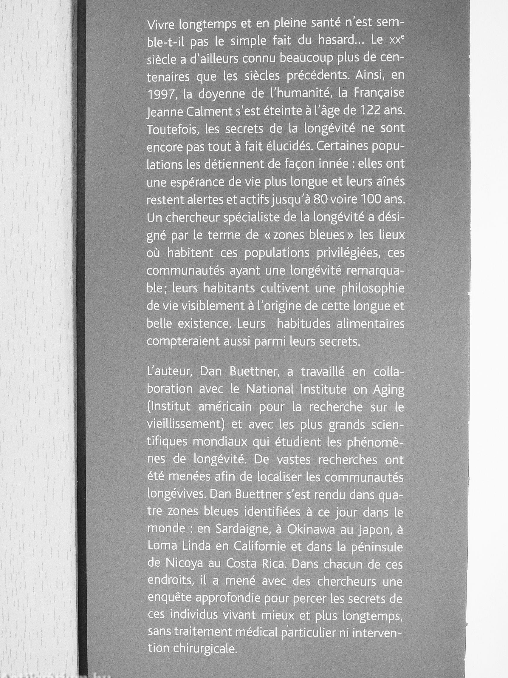 Dan Buettner a découvert ces communautés dans les « zones bleues», ces régions du monde ou les habitants vivent tres longtemps et en bonne santé : en Italie, au Japon, en Californie et au Costa Rica. Au cours d'expéditions organisées dans ces quatre régions du monde, l'auteur a rencontré les populations centenaires et a observé leur mode de vie pour mieux comprendre leur formidable vitalité.