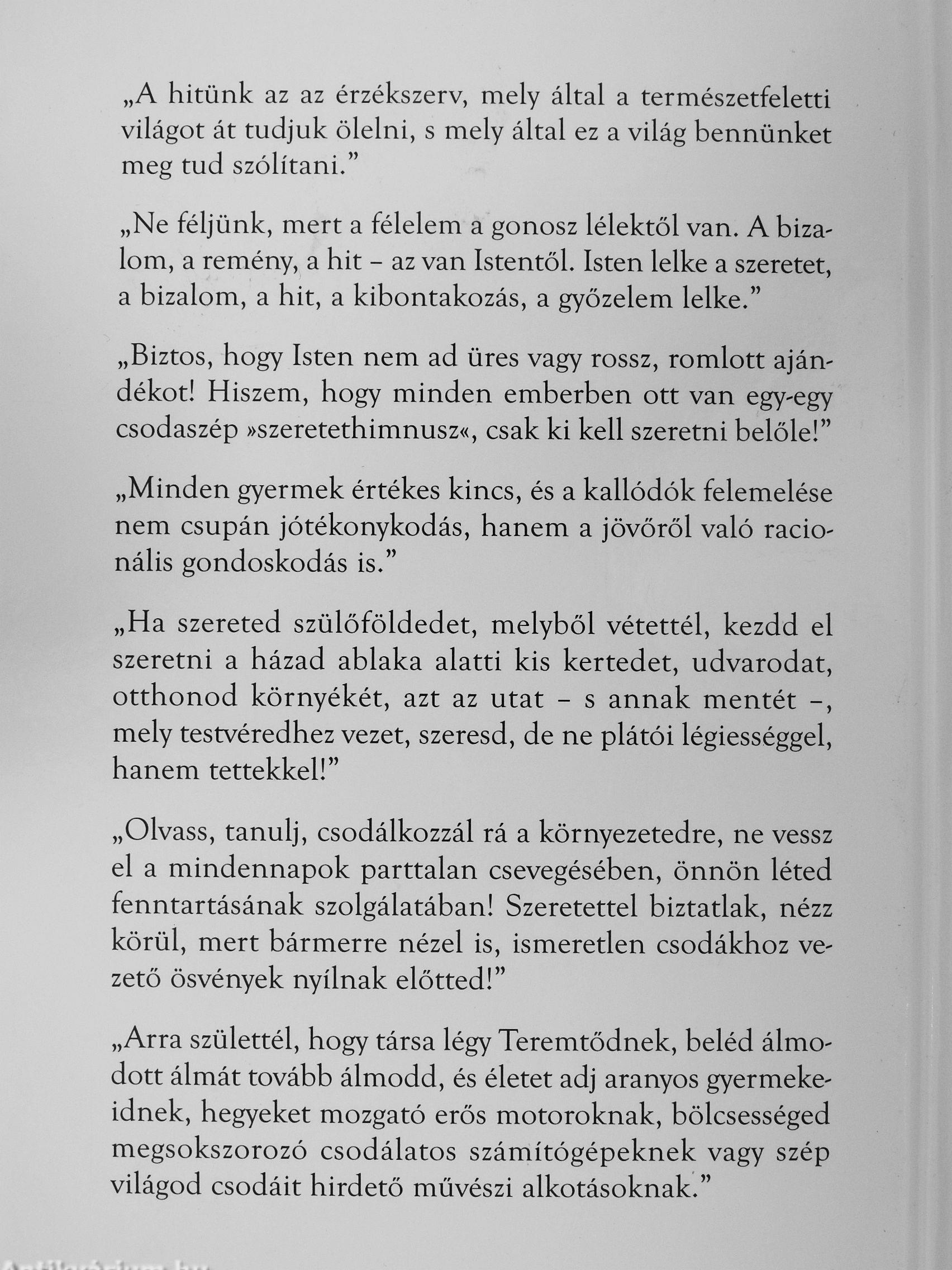„Olvass, tanulj, csodálkozzál rá a környezetedre, ne vessz el a mindennapok parttalan csevegésében, önnön léted fenntartásának szolgálatában! Szeretettel biztatlak, nézz körül, mert bármerre nézel is, ismeretlen csodákhoz vezető ösvények nyílnak előtted!"