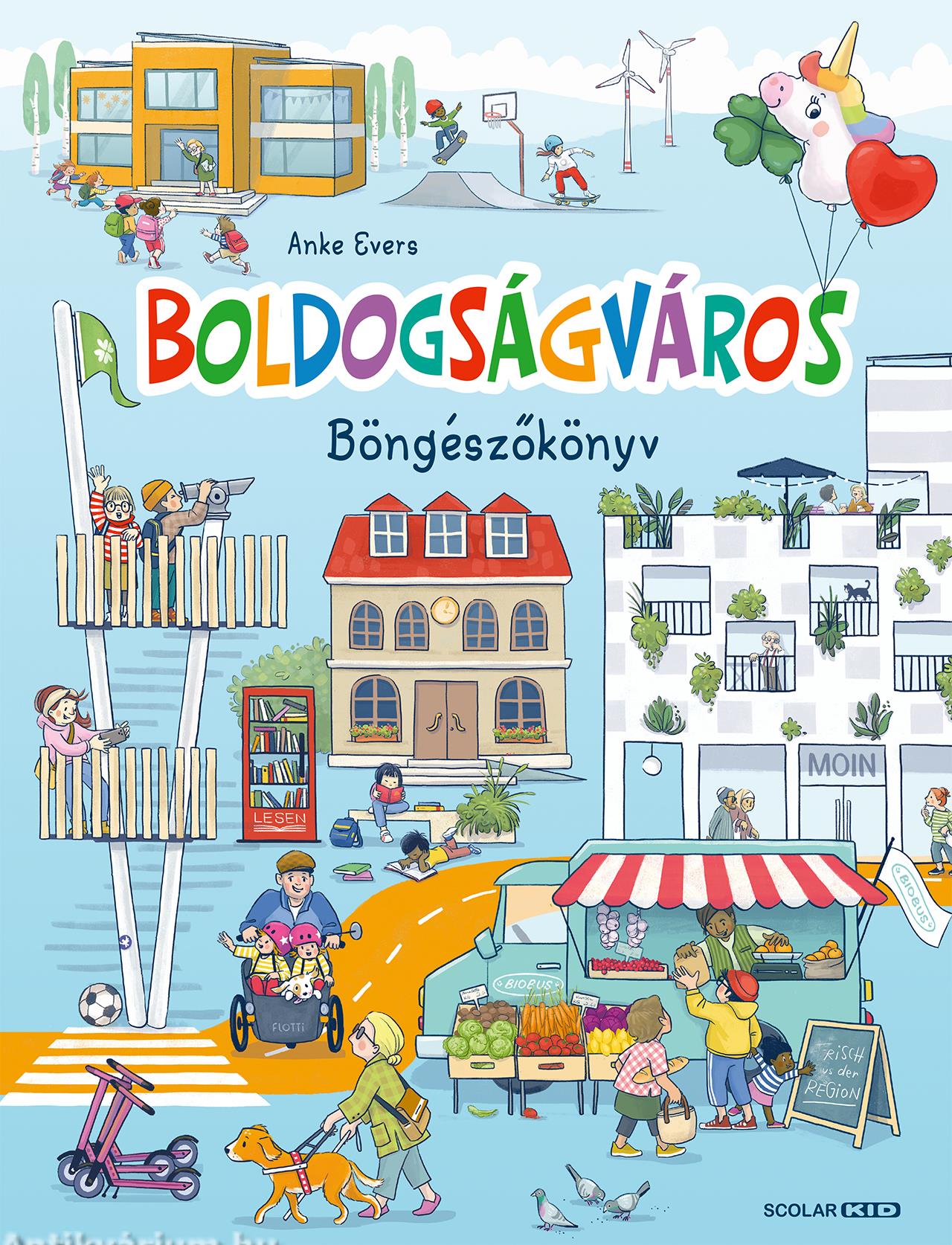 Gyere velünk Boldogságvárosba, és fedezd fel az itteni vidám életet! Hol lehet őzikékkel találkozni a városban? Vajon megtalálod az ablakot mosó ipari alpinistákat? És hol rejtőzhet Frici, az elkóborolt fekete cica? A böngészőkönyv mókás képeit nézegetve Boldogságváros lakóinak örömteli mindennapjai rajzolódnak ki. A könyv belíve nem tartalmaz szöveges oldalakat.