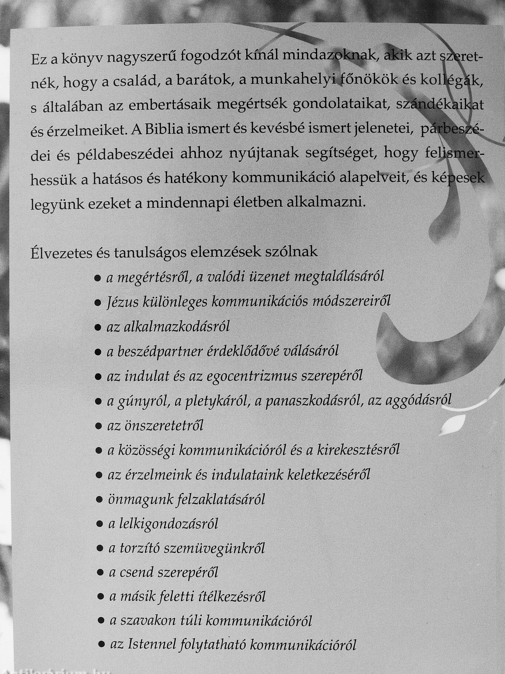 Ez a könyv nagyszerű fogódzót kínál minda:^kjt^k, Ifek azt siratnék, hogy a család, a barátok, a munkahelyi^őnökök és kolkgMk, s általában az embertásaik megértsék gondolataikat, s^^d-|lail<|at és érzelmeiket. A Biblia ismert és kevésbé ismert jelenetei, dei és példabeszédei ahhoz nyújtanak segítséget, hogy felipim^ hessük a hatásos és hatékony kommunikáció alapelveit, és képje^Ic legyünk ezeket a mindennapi életben alkalmazni.