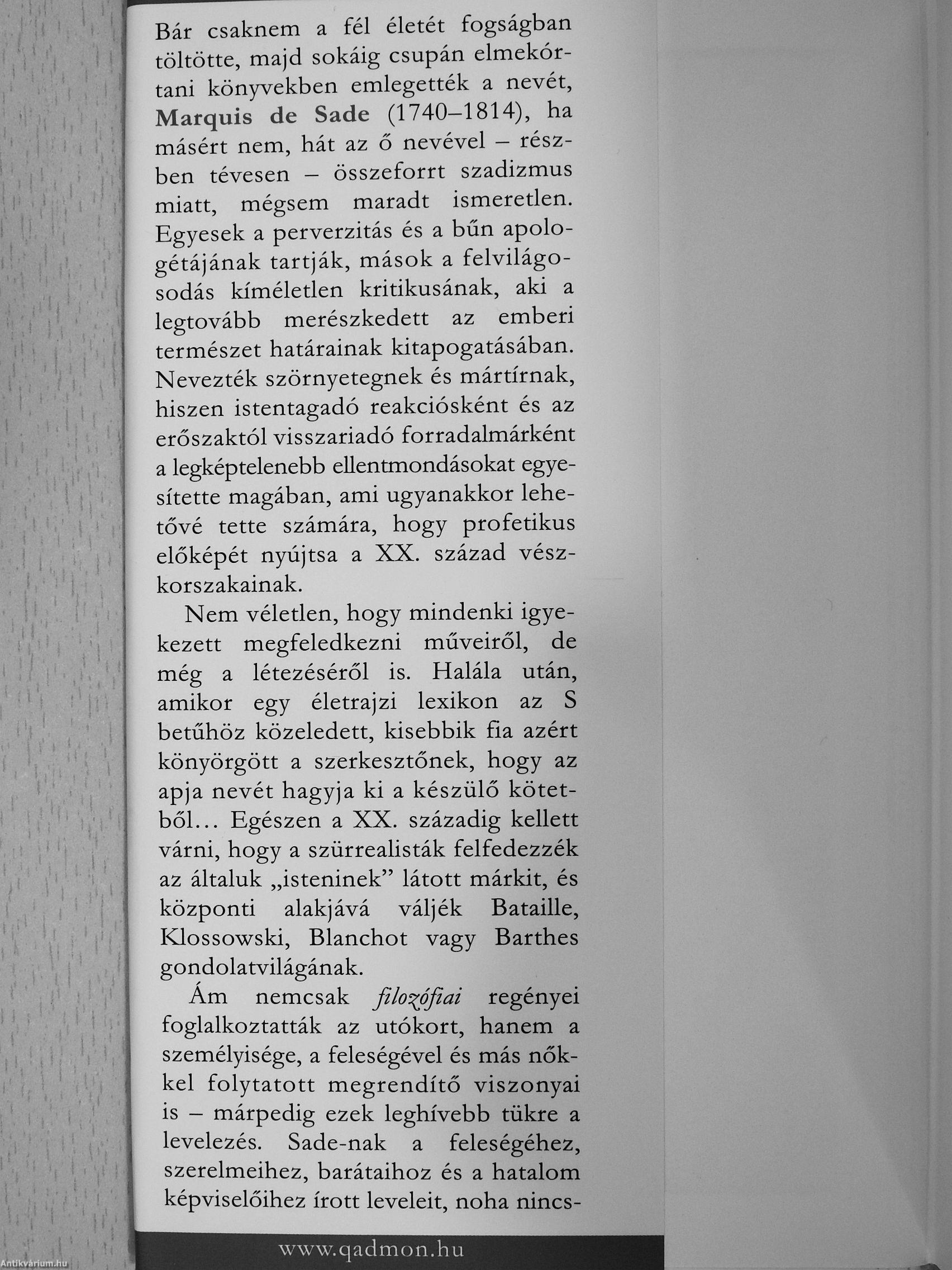 Bár csaknem a fél életét fogságban töltötte, majd sokáig csupán elmekórtani könyvekben emlegették a nevét, Marquis de Sade (1740-1814), ha másért nem, hát az ő nevével - részben tévesen - összeforrt szadizmus miatt, mégsem maradt ismeretlen. Egyesek a perverzitás és a bűn apolo-gétájának tartják, mások a felvilágosodás kíméletlen kritikusának, aki a legtovább merészkedett az emberi természet határainak kitapogatásában. Nevezték szörnyetegnek és mártírnak, hiszen istentagadó reakciósként és az erőszaktól visszariadó forradalmárként a legképtelenebb ellentmondásokat egyesítette magában, ami ugyanakkor lehetővé tette számára, hogy profetikus előképét nyújtsa a XX. század vészkorszakainak.