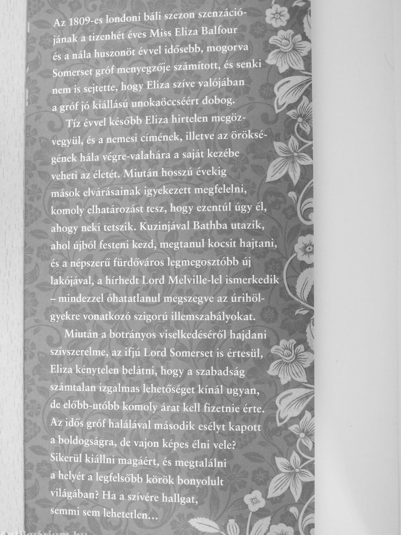 Miután a botrányos viselkedéséről hajdani szívszerelme, az ifjú Lord Somerset is értesül, -Eliza kénytelen belátni, hogy a szabadság számtalan izgalmas lehetőséget kínál ugyan; de előbb-utóbb komoly árat kell fizetnie érte. j Az idős gróf halálával második esélyt kapott ' a boldogságra, de vajon képes élni vele? Sikerül kiállni magáért, és megtalálni ^ ^ a helyét a legfelsőbb körök bonyolult ^ ^ világában? Ha a szívére hallgat,