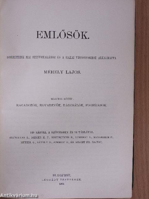 | Megjegyzés: | 148 képpel a szövegben és 19 táblával. Nyomtatta a Légrády Testvérek Kő- és Könyvnyomdai Műintézete Budapesten. Ismereteink mai szinvonalához és a hazai viszonyokhoz alkalmazta Méhely Lajos. Brehm Alfréd "Tierleben" cimű nagy művének magyarra átültetett kiadása. |