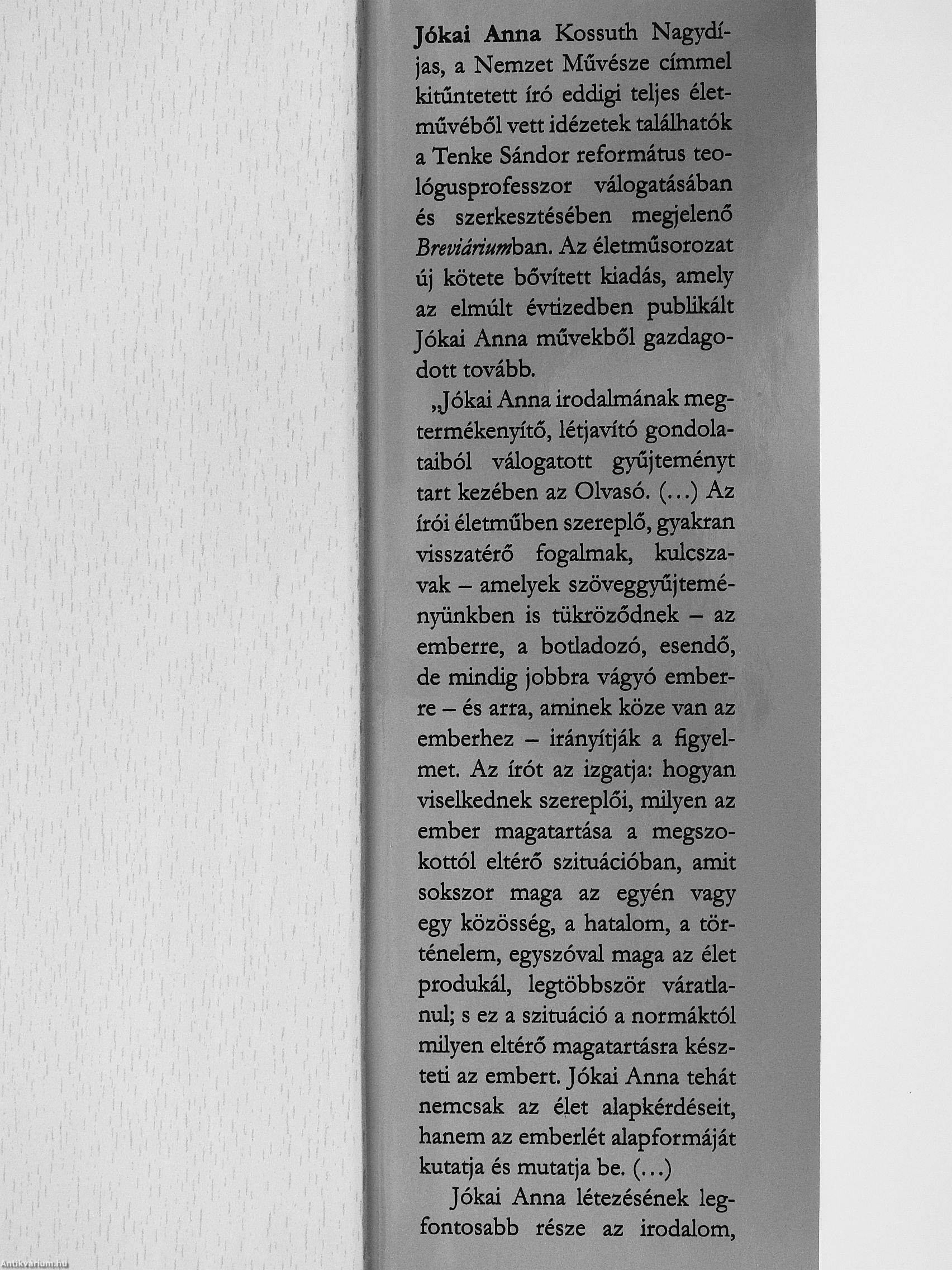 Jókai Anna Kossuth Nagydíjas, a Nemzet Művésze címmel kitűntetett író eddigi teljes életművéből vett idézetek találhatók a Tenke Sándor református teológusprofesszor válogatásában és szerkesztésében megjelenő Breviáriumban. Az életműsorozat új kötete bővített kiadás, amely az elmúlt évtizedben publikált Jókai Anna művekből gazdagodott tovább.