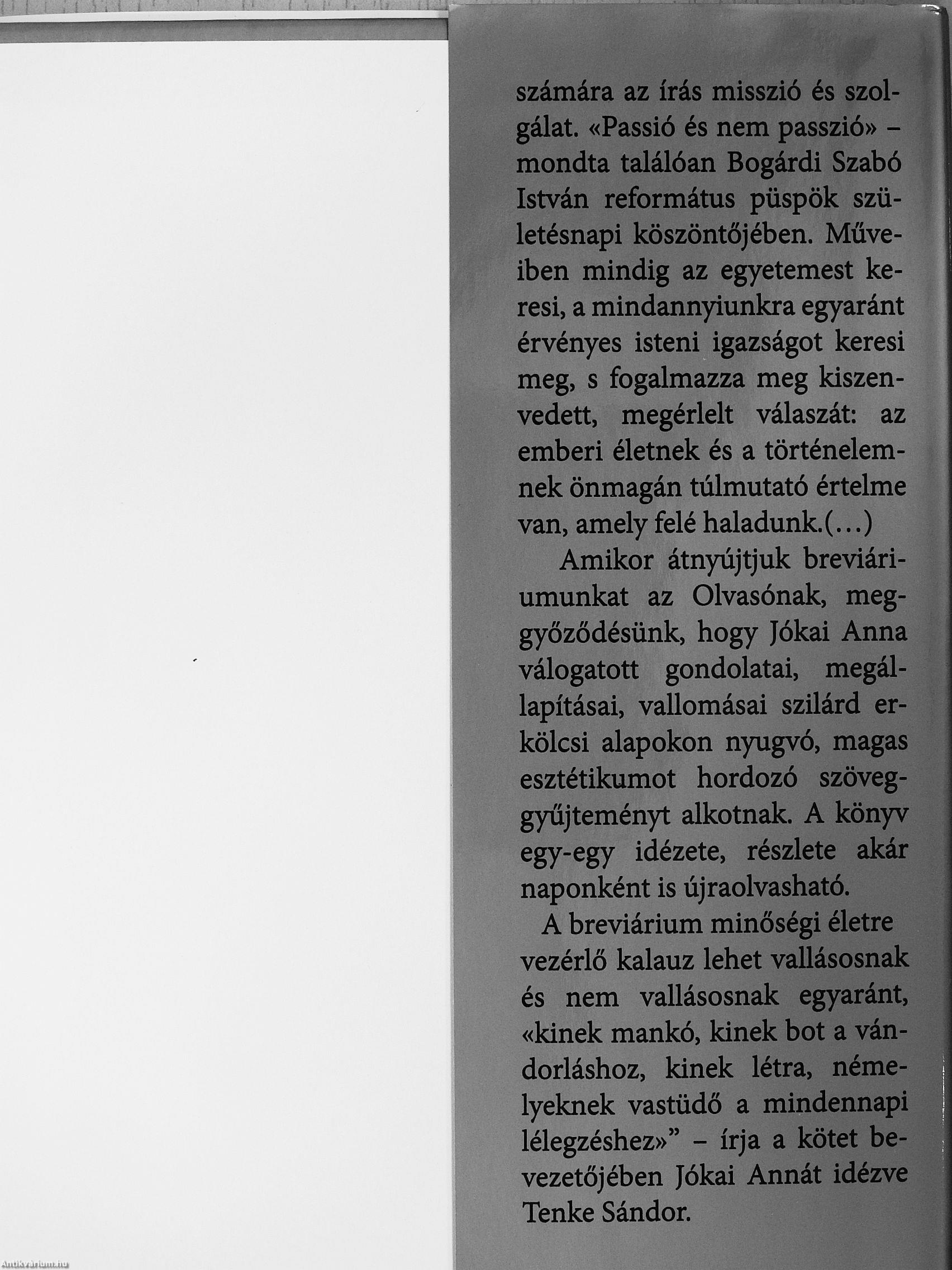 Amikor átnyújtjuk breviáriumunkat az Olvasónak, meggyőződésünk, hogy Jókai Anna válogatott gondolatai, megállapításai, vallomásai szilárd erkölcsi alapokon nyugvó, magas esztétikumot hordozó szöveggyűjteményt alkotnak. A könyv egy-egy idézete, részlete akár naponként is újraolvasható.