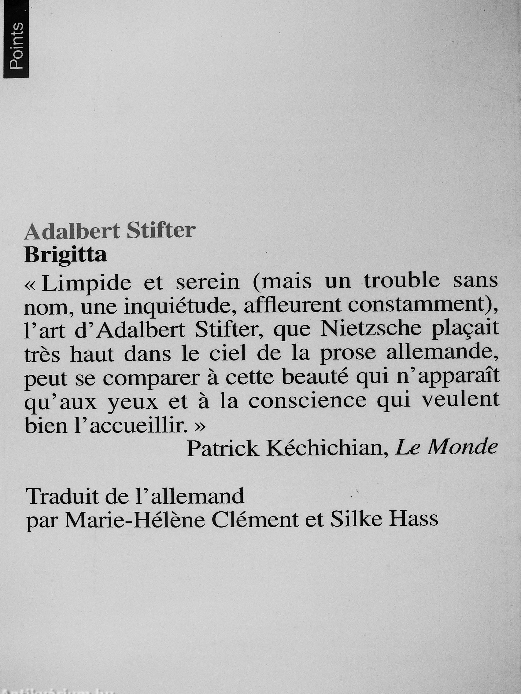 « Limpide et serein (mais un trouble sans nom, une inquiétude, affleurent constamment), l'art d'Adalbert Stifter, que Nietzsche plaçait tres haut dans le ciel de la prose allemande, peut se comparer a cette beauté qui n'apparaît qu'aux yeux et a la conscience qui veulent bien l'accueillir »