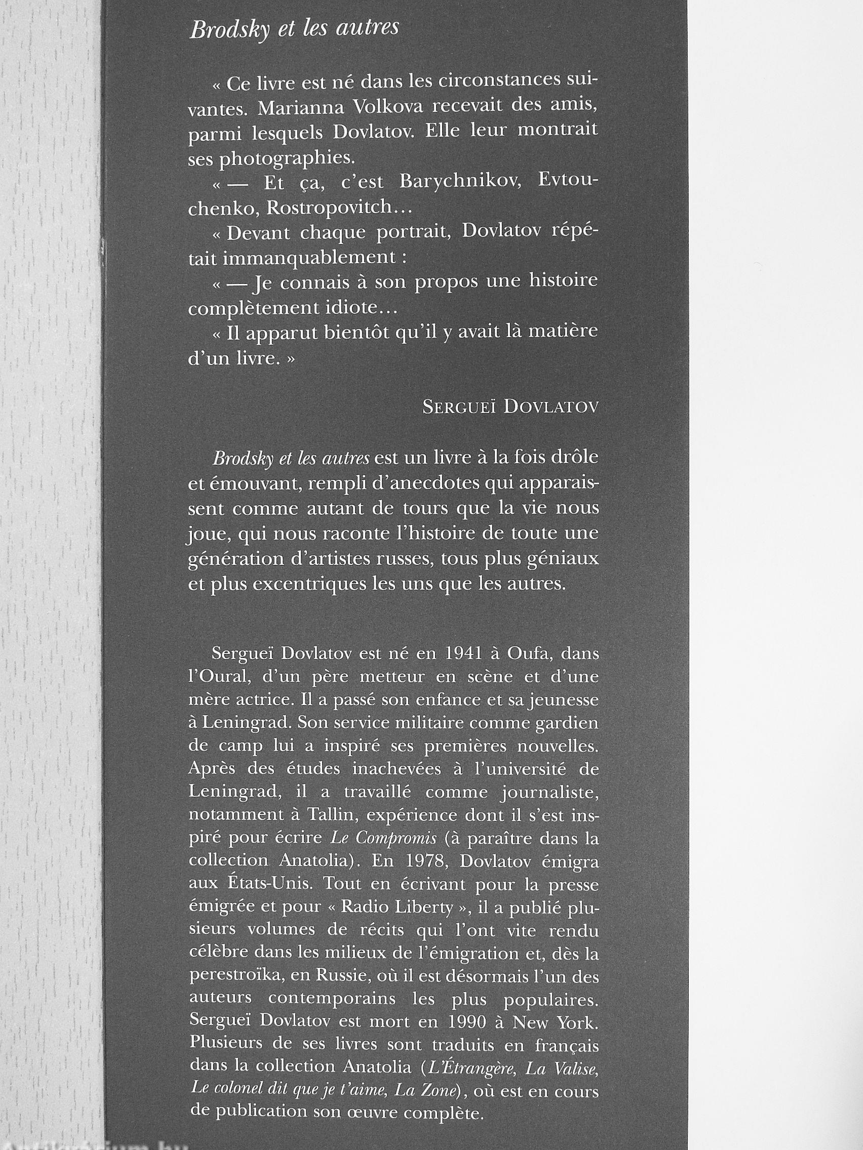 Serguei Dovlatov est né en 1941 a Oufa, dans l'Oural, d'un pere metteur en scene et d'une mere actrice. Il a passé son enfance et sa jeunesse a Leningrad. Son service militaire comme gardien de camp lui a inspiré ses premieres nouvelles. Apres des études inachevées a l'université de Leningrad, il a travaillé comme journaliste, notamment a Tallin, expérience dont il s'est inspiré pour écrire Le Compromis (a paraître dans la collection Anatolia). En 1978, Dovlatov émigra aux Etats-Unis. Tout en écrivant pour la presse émigrée et pour « Radio Liberty », il a publié plusieurs volumes de récits qui l'ont vite rendu célebre dans les milieux de l'émigration et, des la perestroika, en Russie, ou il est désormais l'un des auteurs contemporains les plus populaires. Serguei Dovlatov est mort en 1990 a New York. Plusieurs de ses livres sont traduits en français dans la collection Anatolia {L'Étrangere, La Valise, Le colonel dit que je t'aime, La Zone), ou est en cours de publication son ouvre complete.