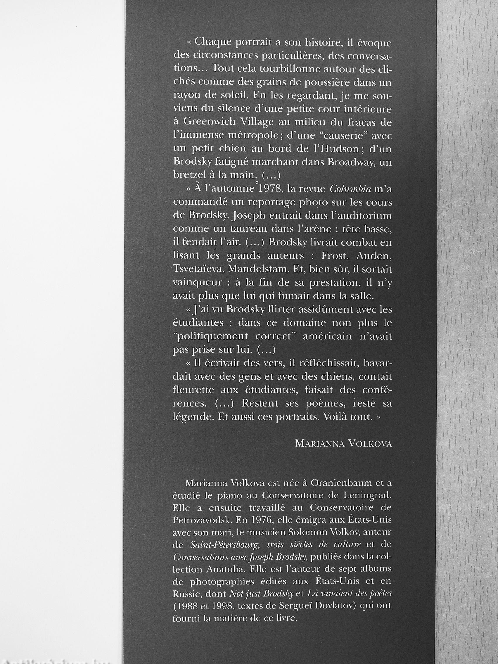 « A l'automne 1978, la revue Columbia m'a commandé un reportage photo sur les cours de Brodsky. Joseph entrait dans l'auditorium comme un taureau dans l'arene : tete basse, il fendait l'air. ( ) Brodsky livrait combat en lisant les grands auteurs : Frost, Auden, Tsvetaieva, Mandelstam. Et, bien sur, il sortait vainqueur : a la fin de sa prestation, il n'y avait plus que lui qui fumait dans la salle.