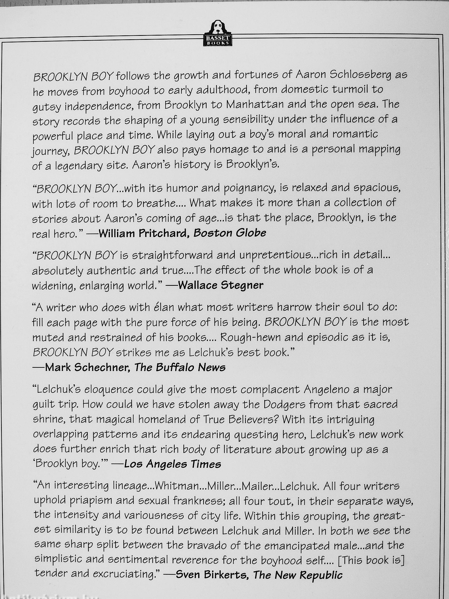 "A writer who does with elan what most writers harrow their soul to do: fill each page with the pure force of his being. dKOOKLYN BOY is the most muted and restrained of his books Rough-hewn and episodic as it is, BROOKLYN BOY strikes me as Leichuk's best book." —Mark Schechner, The Buffalo News