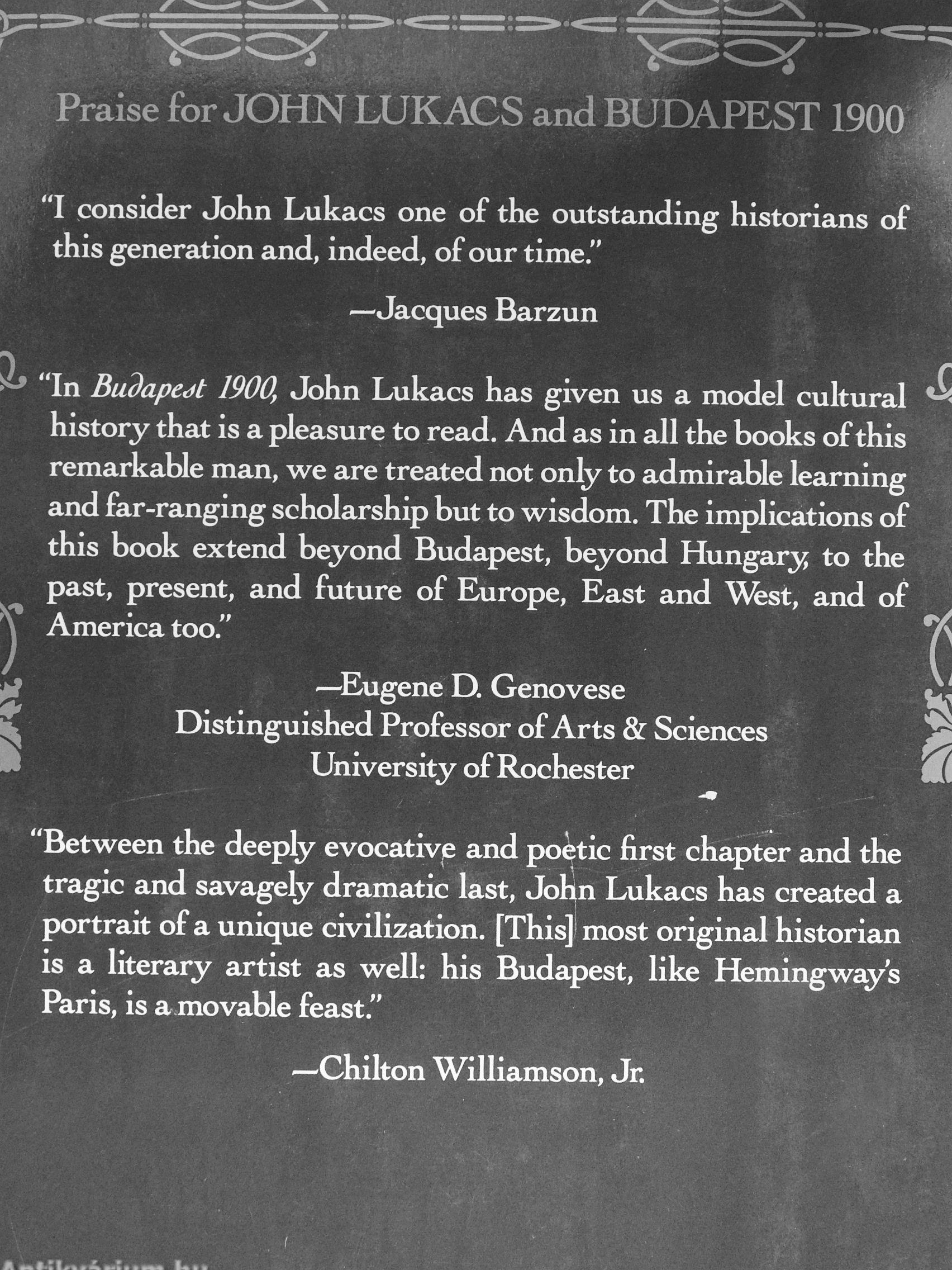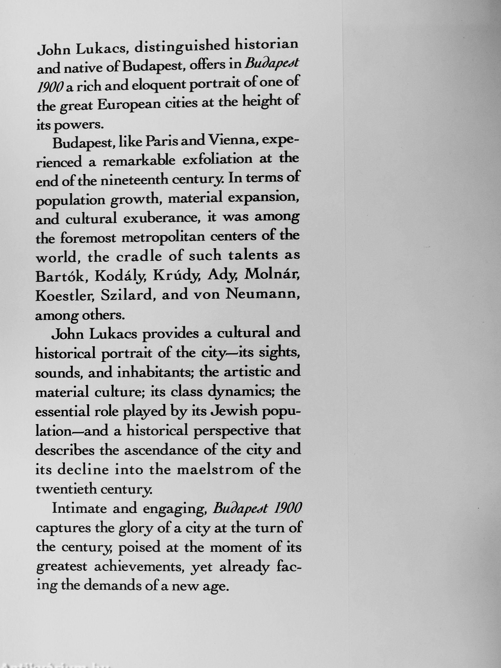 Between the deeply evocative and poetic first chapter and the tragic and savagely dramatic last, John Lukacs has created a portrait of a unique civilization. [This] most original historian is a literary artist as well: his Budapest, like Hemingways Paris, is a movable feast."