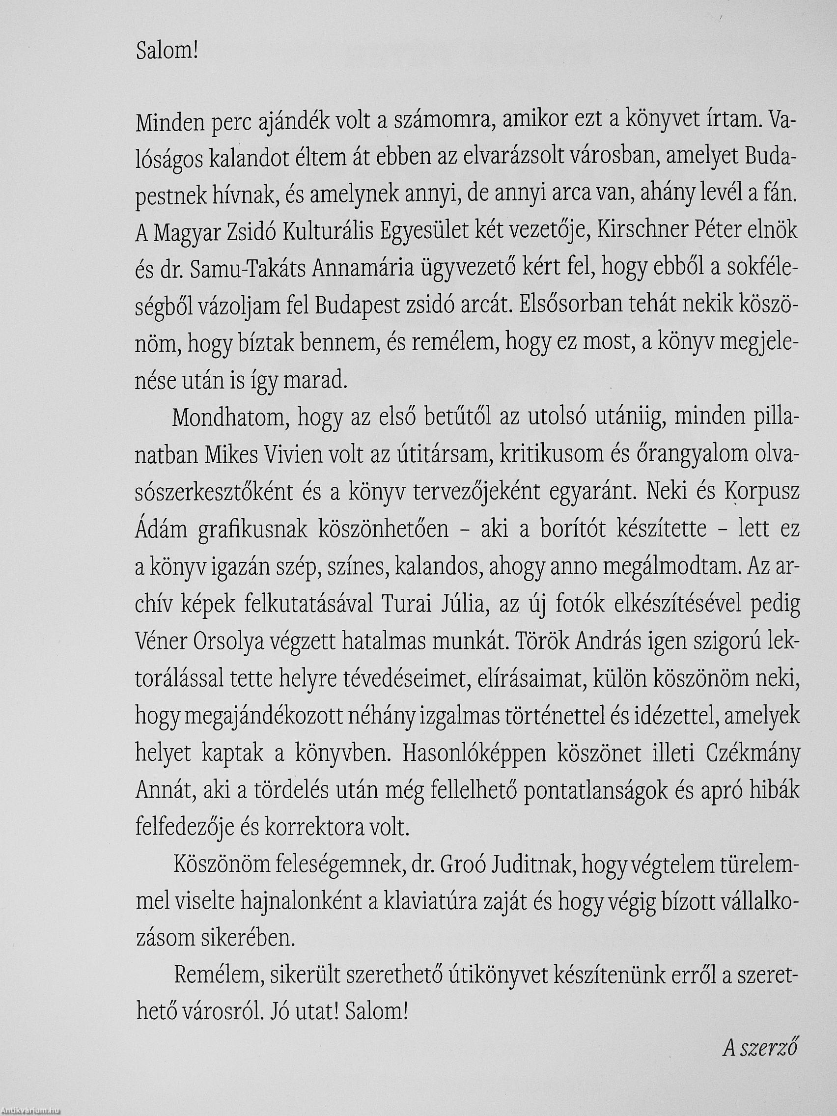 Ma ismét van zsidó negyed, ahol ugyan a hitélet kisebb, a szórakoztatás nagyobb részt képvisel, de lehet kóser ételt enni, nyáron táncolni, szórakozni a Zsidó Kulturális Fesztiválon vagy a Sóletfesztiválon. Ezeken az eseményeken - sőt néhol még a zsinagógákban is - egyre több a fiatal. Ez is Budapest új, zsidó arcához tartozik. Minderről e könyv mesél az olvasónak.