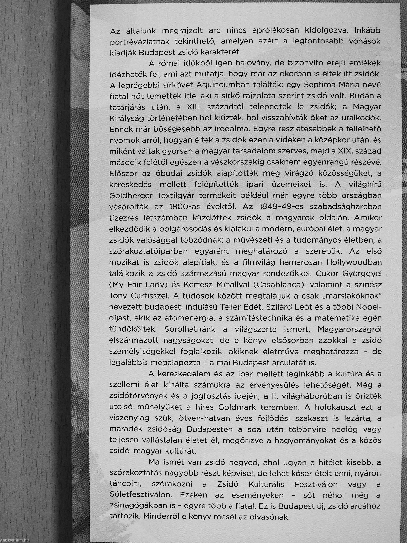 A római Időkből igen halovány, de bizonyító erejű emlékek Idézhetök fel, ami azt mutatja, hogy már az ókorban Is éltek itt zsidók. A legrégebbi sírkövet Aquincumban találták: egy Septima Mária nevű fiatal nőt temettek ide, aki a sírkő rajzolata szerint zsidó volt. Budán a tatárjárás után, a XIII. századtól telepedtek le zsidók; a Magyar Királyság történetében hol kiűzték, hol visszahívták őket az uralkodók. Ennek már bőségesebb az irodalma. Egyre részletesebbek a fellelhető nyomok arról, hogyan éltek a zsidók ezen a vidéken a középkor után, és miként váltak gyorsan a magyar társadalom szerves, majd a XIX. század második felétől egészen a vészkorszakig csaknem egyenrangú részévé. Először az óbudai zsidók alapították meg virágzó közösségüket, a kereskedés mellett felépítették ipari üzemeiket is. A világhírű Goldberger Textilgyár termékeit például már egyre több országban vásárolták az 1800-as évektől. Az 1848-49-es szabadságharcban tízezres létszámban küzdöttek zsidók a magyarok oldalán. Amikor elkezdődik a polgárosodás és kialakul a modern, európai élet, a magyar zsidók valósággal tobzódnak; a művészeti és a tudományos életben, a szórakoztatóiparban egyaránt meghatározó a szerepük. Az első mozikat is zsidók alapítják, és a filmvilág hamarosan Hollywoodban találkozik a zsidó származású magyar rendezőkkel: Cukor Györggyel (My Fair Lady) és Kertész Mihállyal (Casablanca), valamint a színész Tony Curtisszel. A tudósok között megtaláljuk a csak „marslakóknak" nevezett budapesti indulású Teller Edét, Szilárd Leót és a többi Nobeldíjast, akik az atomenergia, a számítástechnika és a matematika egén tündököltek. Sorolhatnánk a világszerte ismert, Magyarországról elszármazott nagyságokat, de e könyv elsősorban azokkal a zsidó személyiségekkel foglalkozik, akiknek életműve meghatározza - de legalábbis megalapozta - a mai Budapest arculatát is.