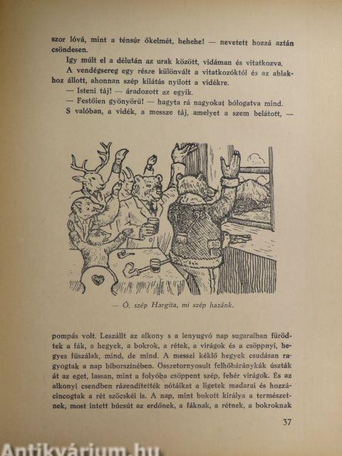 Halkuljon el minden csöppnyi zaj meleg szobátokban és keljetek föl nesztelen, hagyjátok ott a vidáman pattogó tüzet, a duruzsoló kályhát és jőjjetek, induljatok el velem a messzi Hargita felé. Nézzétek, ahol a legmagasabban kéklik a hegy orma, ahonnan a legszebben csillog-villog a sziklarengeteg, s ahol madárdalos erdő veszi körül a barlangtokat, ott van a mi mackóinknak a hazája, ott dirmeg-dörmög kedvére a tekintetes úr, ott falatozik nagyokat a bátya, s ott visítoznak hangosan a bocsok...