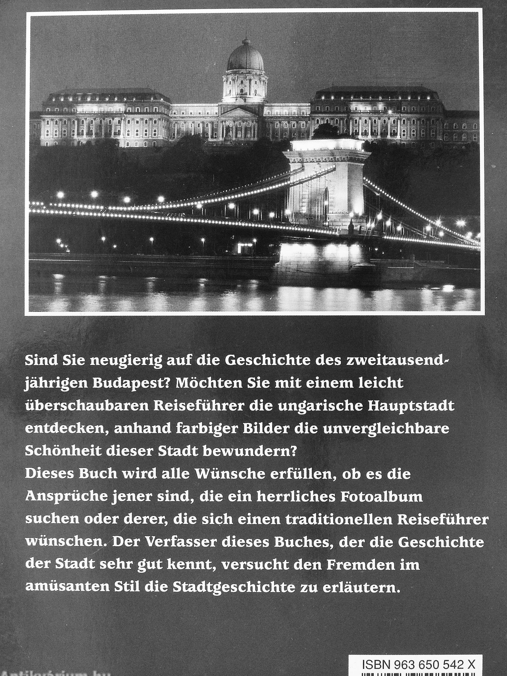 Sind Sie neugierig auf die Geschichte des zweitausend^ jährigen Budapest? Möchten Sie mit einem leicht überschaubaren Reiseführer die ungarische Hauptstadt entdecken, anhand farbiger Bilder die unvergleichbare Schönheit dieser Stadt bewundern? Dieses Buch wird alle Wünsche erfüllen, ob es die Ansprüche jener sind, die ein herrliches Fotoalbum suchen oder derer, die sich einen traditionellen Reiseführer wünschen. Der Verfasser dieses Buches, der die Geschichte der Stadt sehr gut kennt, versucht den Fremden im amüsanten Stil die Stadtgeschichte zu erläutern.
