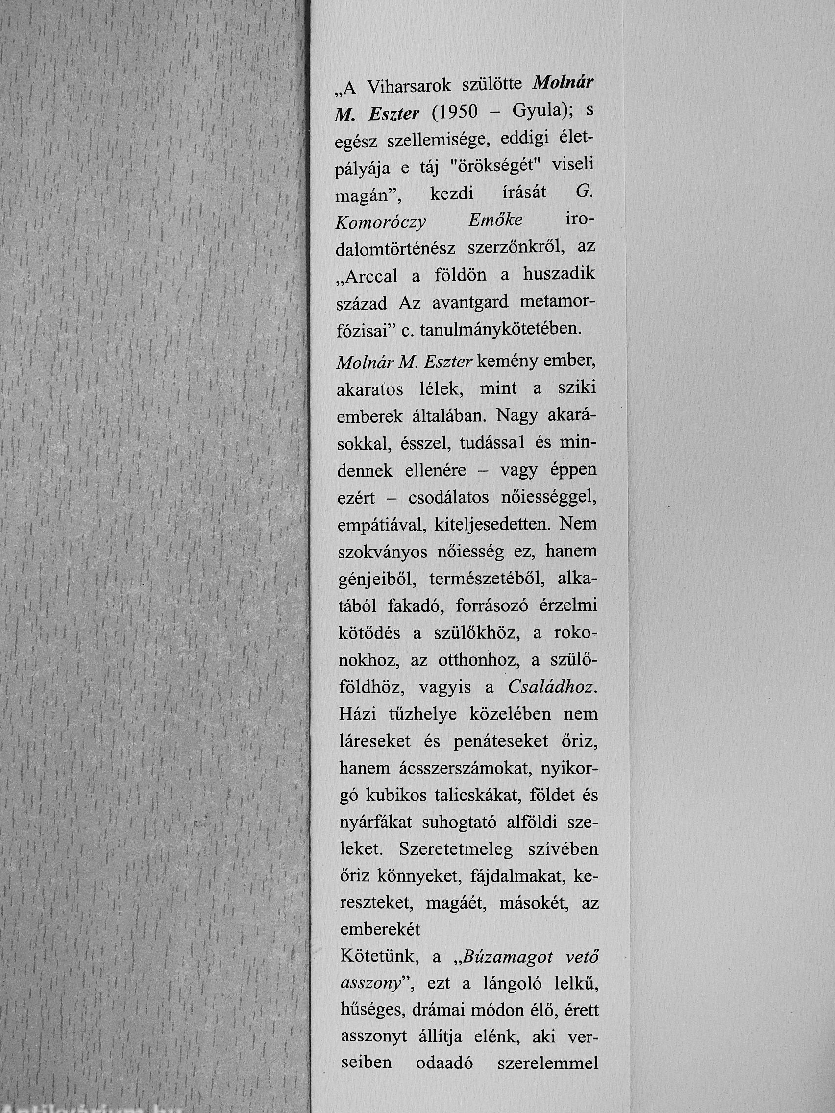 „A Viharsarok szülötte Molnár M. Eszter (1950 - Gyula); s egész szellemisége, eddigi életpályája e táj "örökségét" viseli magán", kezdi írását G. Komoróczy Emőke irodalomtörténész szerzőnkről, az „Arccal a földön a huszadik század Az avantgard metamorfózisai" c. tanulmánykötetében. Molnár M. Eszter kemény ember, akaratos lélek, mint a sziki emberek általában. Nagy akarásokkal, ésszel, tudással és mindennek ellenére - vagy éppen ezért - csodálatos nőiességgel, empátiával, kiteljesedetten. Nem szokványos nőiesség ez, hanem génjeiből, természetéből, alkatából fakadó, forrásozó érzelmi kötődés a szülőkhöz, a rokonokhoz, az otthonhoz, a szülőföldhöz, vagyis a Családhoz. Házi tűzhelye közelében nem láreseket és...