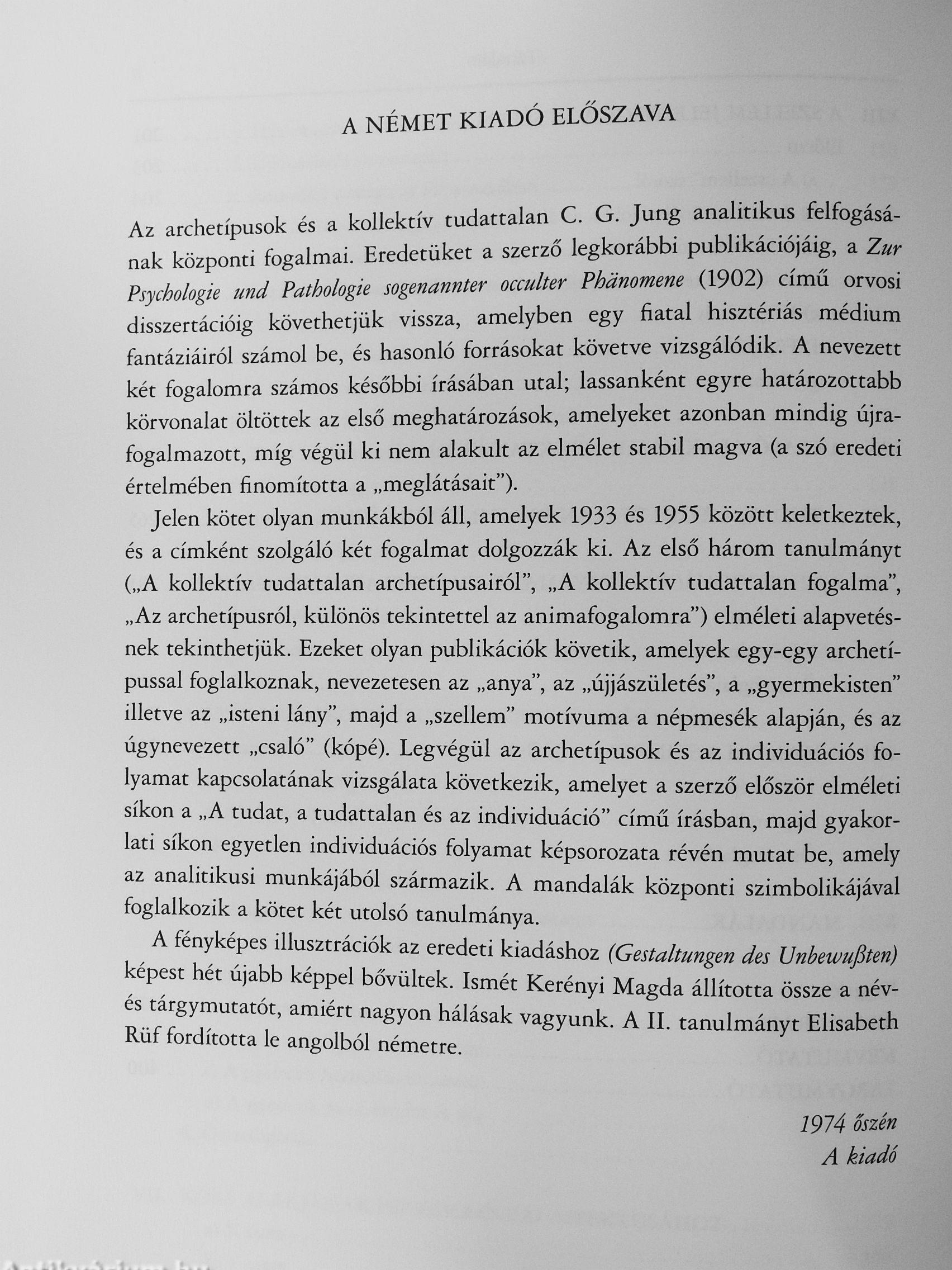 Jelen kötet olyan munkákból áll, amelyek 1933 és 1955 között keletkeztek, és a címként szolgáló két fogalmat körvonalazzák, dolgozzák ki. Az első három tanulmányt („A kollektív tudattalan archetípusairól", „A kollektív tudattalan fogalma", „Az archetípusról, különös tekintettel az anima fogalmára") elméleti alapvetésnek tekinthetjük. Ezeket...