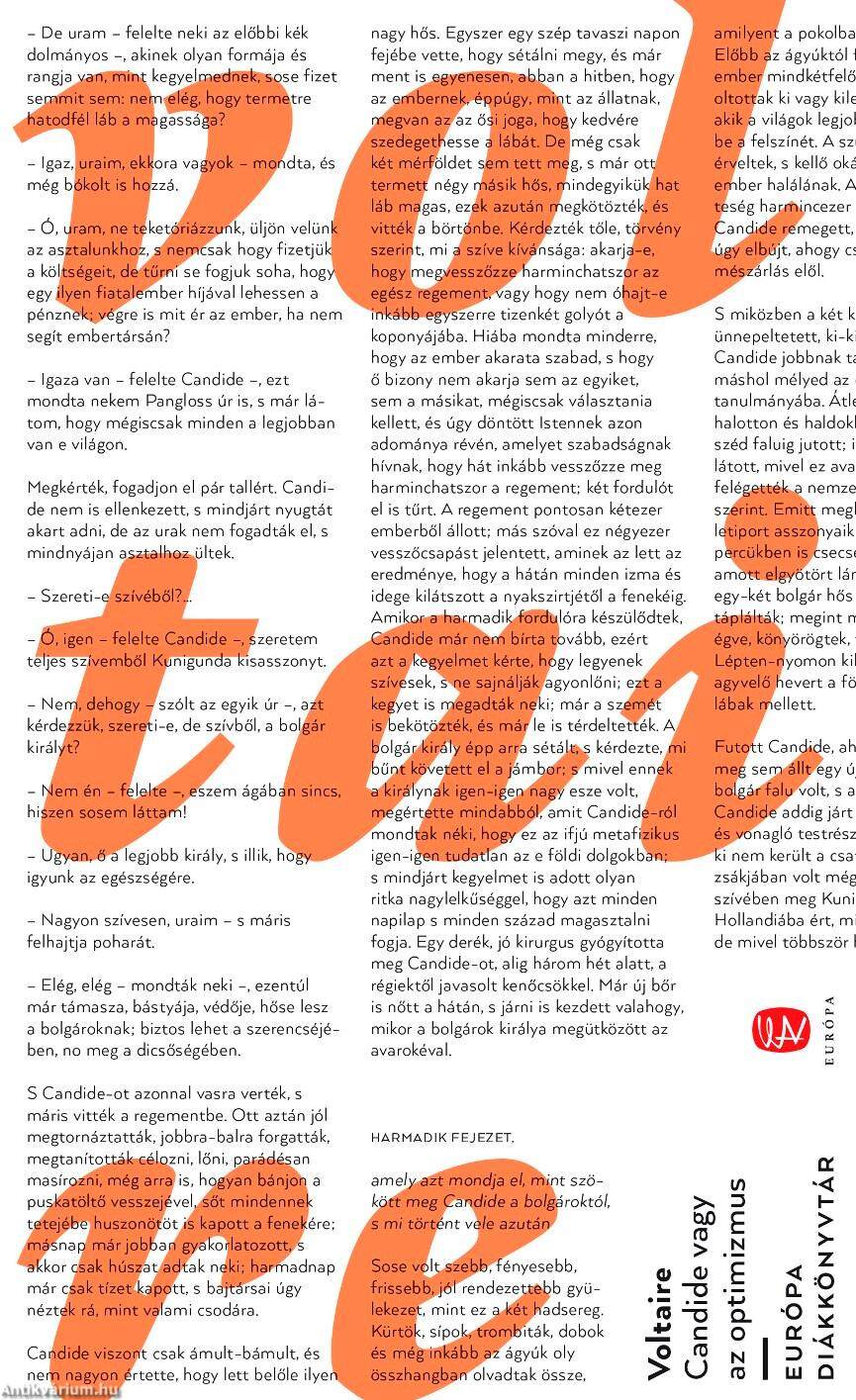 A voltaire-i életmű meghatározó jelentőségű alkotása, a Candide vagy az optimizmus egyszerre tézis- és kalandregény. Hősét, az egyszerű és hiszékeny ifjút - akit filozófus nevelője, Pangloss a nagy Leibniz nyomán arra tanít, hogy ez a világ a lehetséges világok legjobbika - Voltaire végigvezeti benne az egész földgolyón, Vesztfáliától Hollandián keresztül Portugáliáig és Eldorádóig, majd vissza, Európán át Isztambulig és végül Rodostóig. Candide útja társaival együtt háborúból háborúba, katasztrófából végveszélybe visz; végigszenvedik mindazt a rosszat, ami igencsak ellentmond mestere tanításainak. Candide ki is ábrándul ez utóbbiakból, de nem esik kétségbe.## Voltaire (1694-1778) a filozófiával szemben az élet elsődlegességét hirdetve ráébreszti hősét, hogy földünk nem mennyország ugyan, de nem is pokol. Candide földet vásárol, és imádott hölgye, Kunigunda, meg a többiek társaságában békés munkálkodásba fog: "Dolgozzunk, ne okoskodjunk" - mondja a mű végén az egyik főhős.
