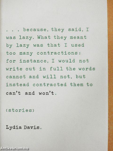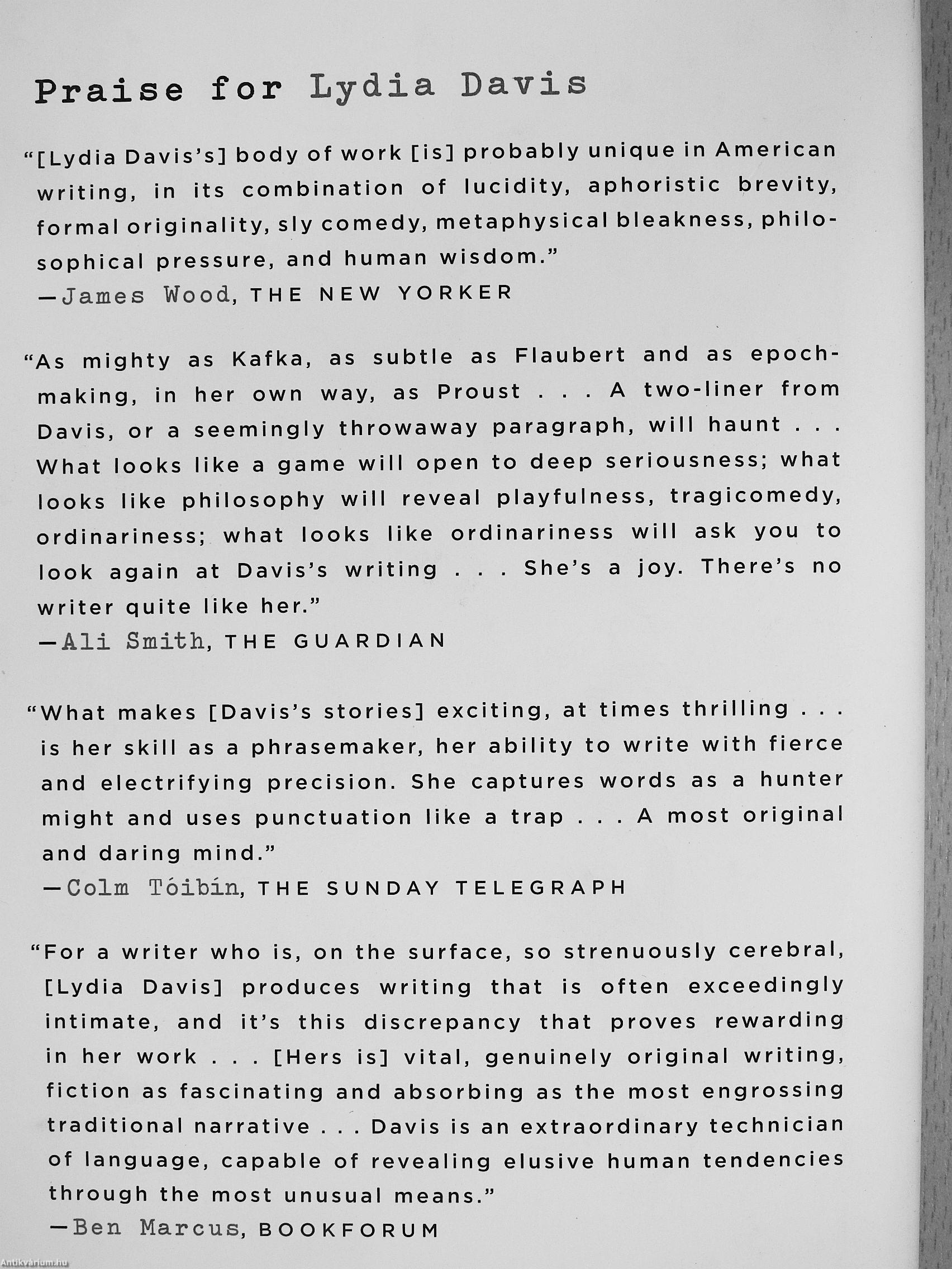 "[Lydia Davis's] body of work [is] probably unique in American writing, in its combination of lucidity, aphoristic brevity, formal originality, sly comedy, metaphysical bleakness, philosophical pressure, and human wisdom." -James Wood, the n e v^ yorker