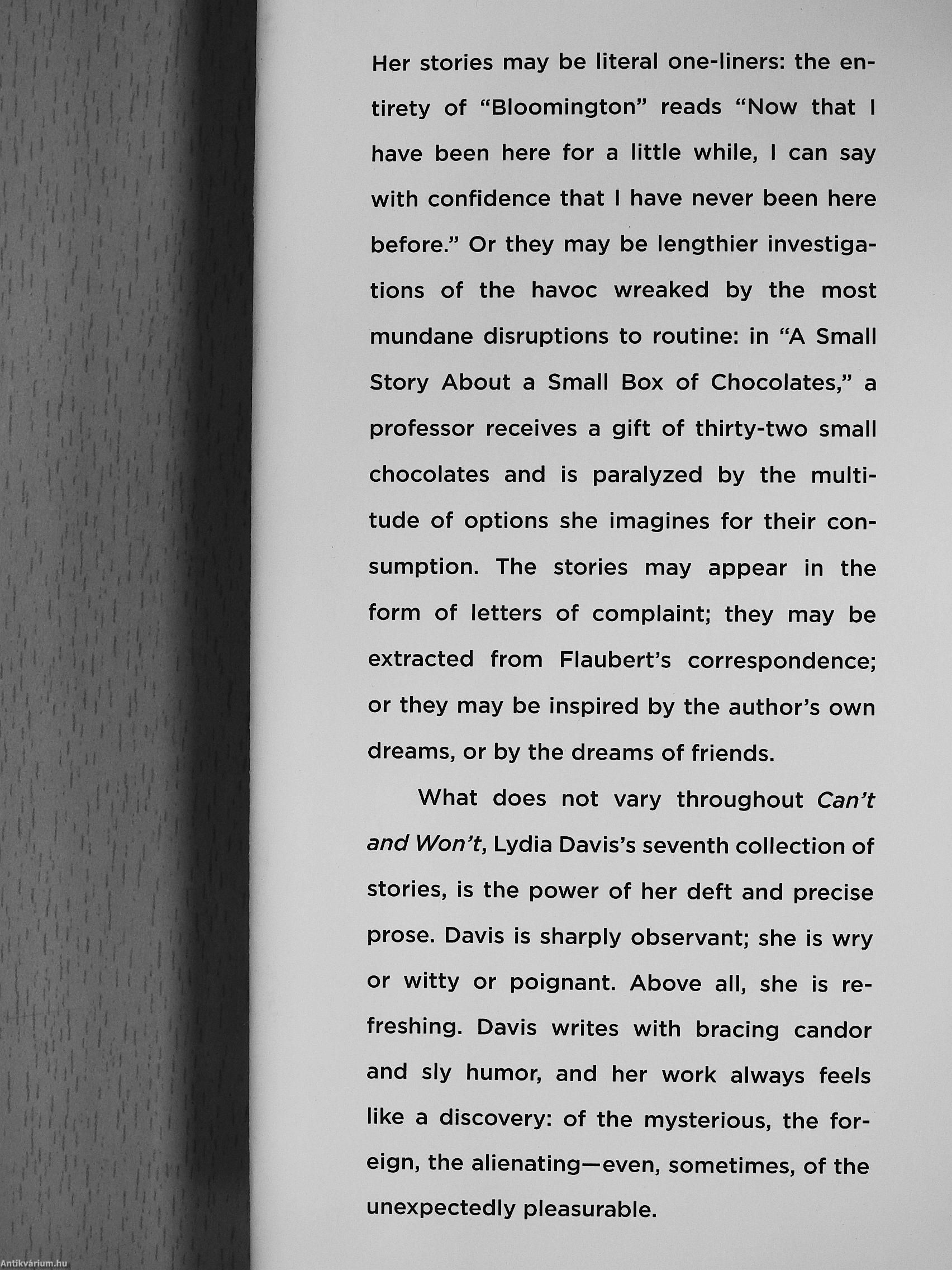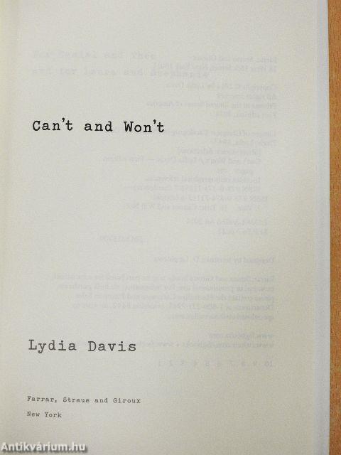 What does not vary throughout Can't and Won't, Lydia Davis's seventh collection of stories, is the power of her deft and precise prose. Davis is sharply observant; she is wry or witty or poignant. Above all, she is refreshing. Davis writes with bracing candor and sly humor, and her work always feels like a discovery: of the mysterious, the foreign, the alienating—even, sometimes, of the unexpectedly pleasurable.