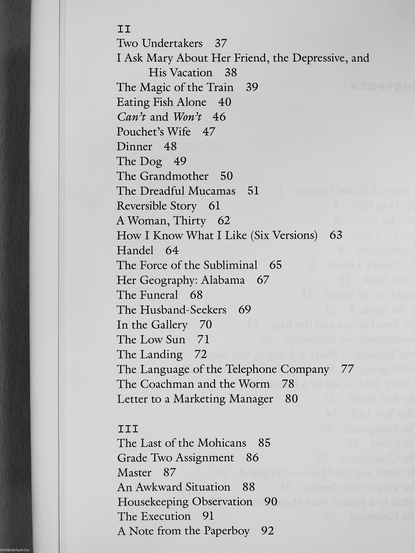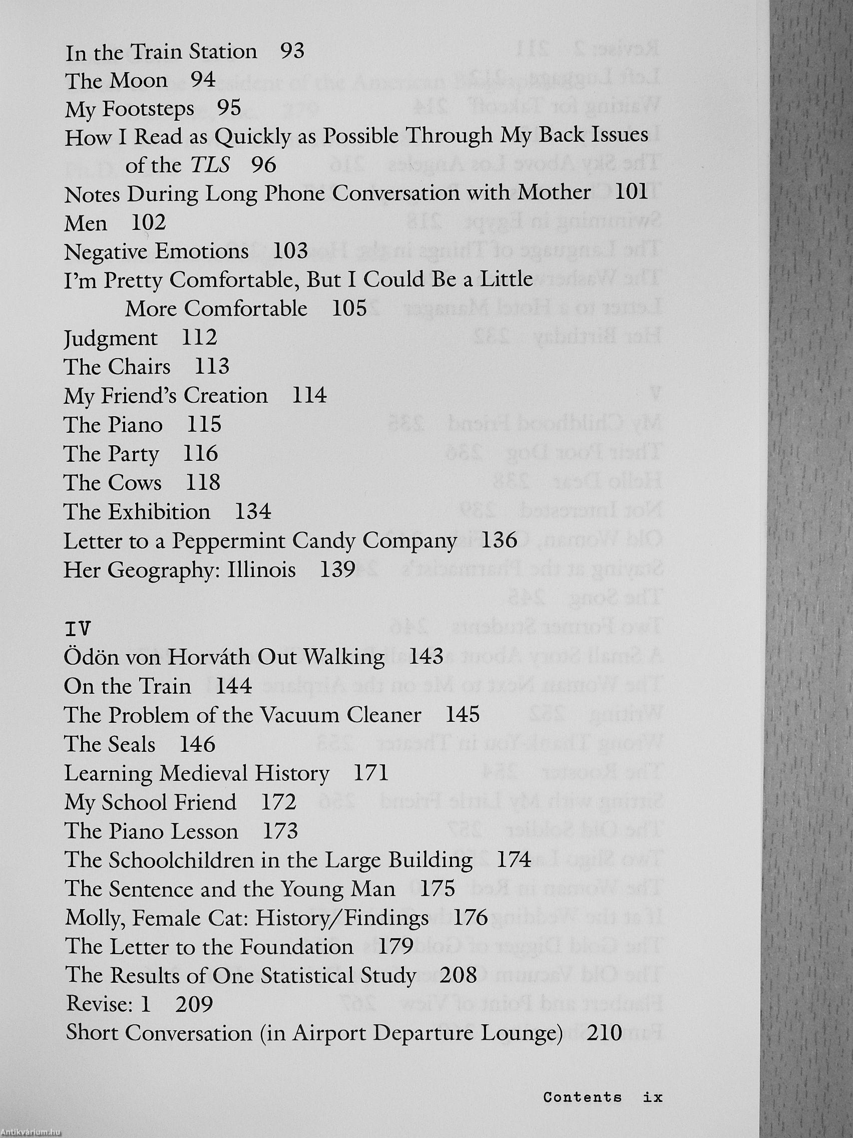 Her stories may be literal one-liners: the entirety of "Bloomington" reads "Now that I have been here for a little while, I can say with confidence that I have never been here before." Or they may be lengthier investigations of the havoc wreaked by the most mundane disruptions to routine: in "A Small Story About a Small Box of Chocolates," a professor receives a gift of thirty-two small chocolates and is paralyzed by the multitude of options she imagines for their consumption. The stories may appear in the form of letters of complaint; they may be extracted from Flaubert's correspondence; or they may be inspired by the author's own dreams, or by the dreams of friends.