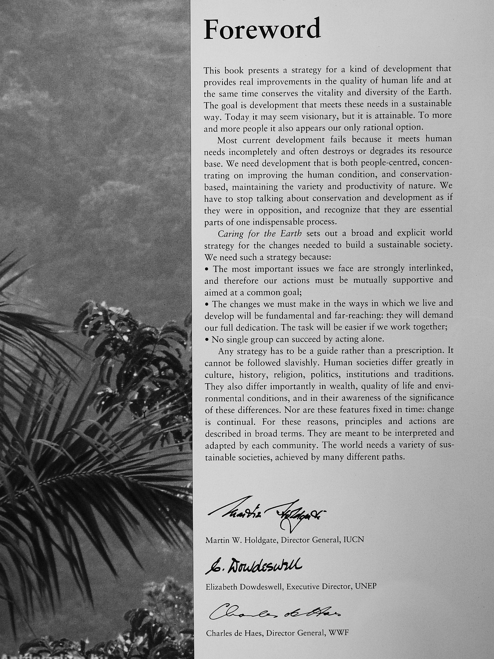 Caring for the Earth is a plan of action for the survival of our planet and its inhabitants. It is the considered view of three major global conservation organizations. It sets out the principles and actions on which the future of our societies depend.
