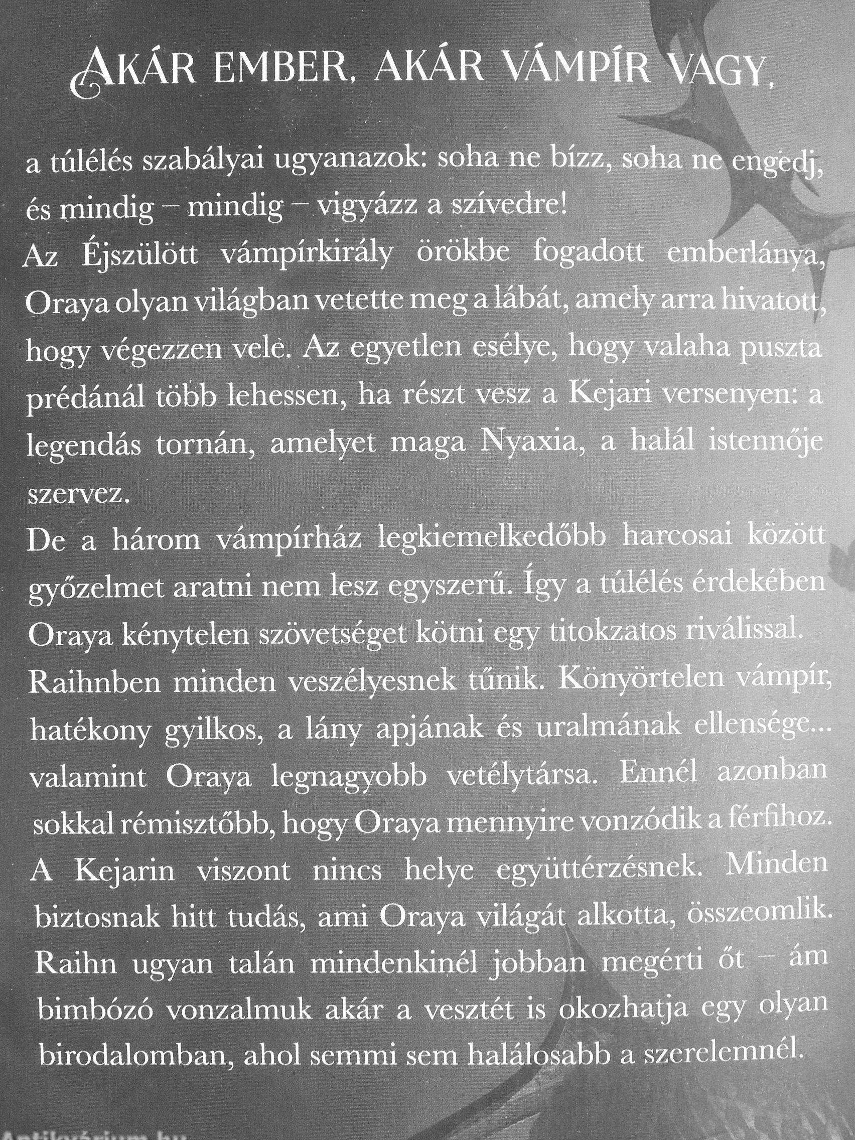 De a három vámpírház legkiemelkedőbb harcosai között győzelmet aratni nem lesz egyszerű. így a túlélés érdekében Oraya kénytelen szövetséget kötni egy titokzatos riválissal. Raihnben minden veszélyesnek tűnik. Könyörtelen vámpír, hatékony gyilkos, a lány apjának és uralmának ellensége Vcilamint Oraya legnagyobb vetélytársa. Ennél azonban sokkal rémisztőbb, hogy Oraya mennyire vonzódik a féríihoz. A Kejarín viszont nincs helye együttérzésnek. Minden biztosnak hitt tudás, ami Oraya világát alkotta, összeomlik. Raihn ugyan talán mindenkinél jobban megérd őt ám bimbózó vonzalmuk akár a vesztét is okozhatja egy olyan birodalomban, ahol semmi sem halálosabb a szerelemnél.